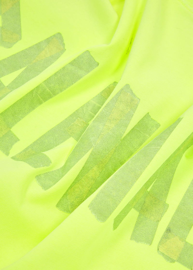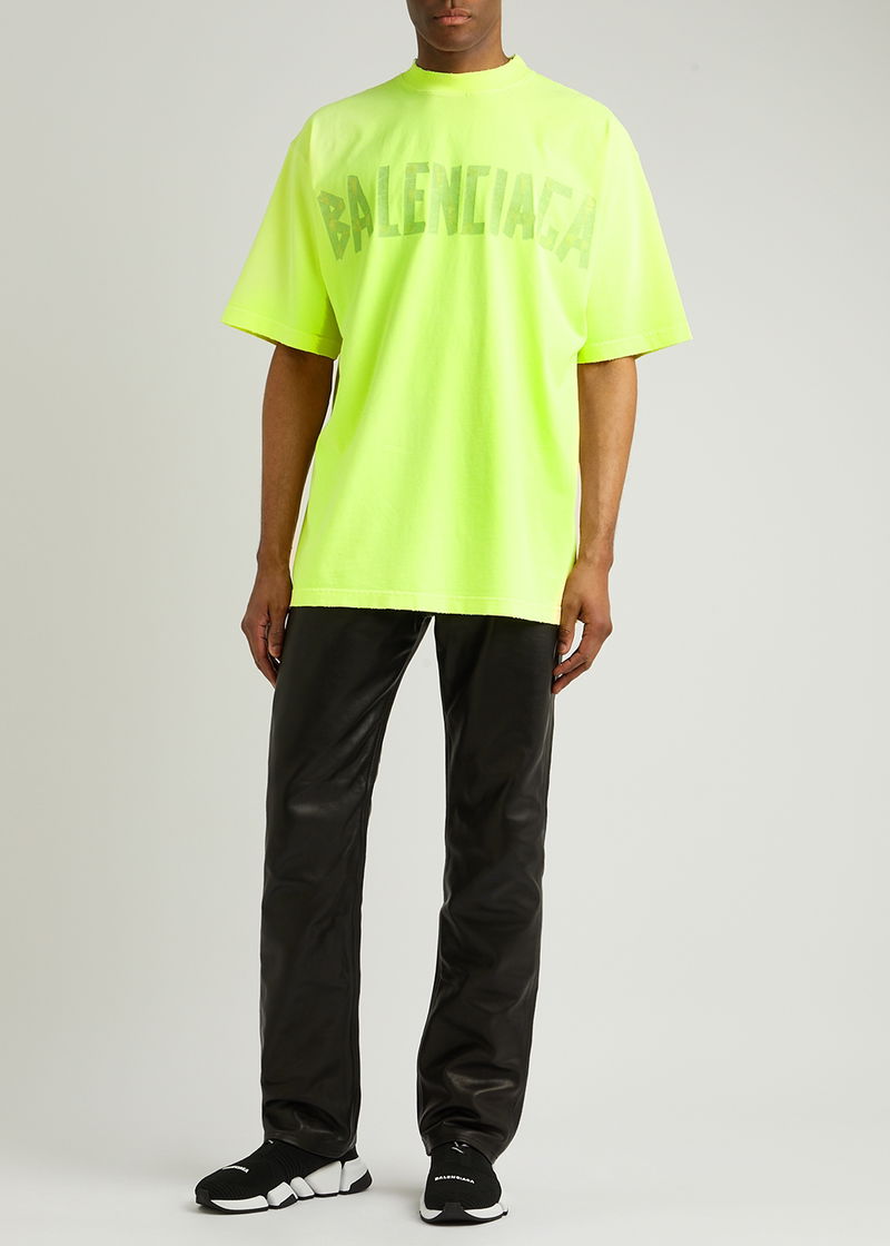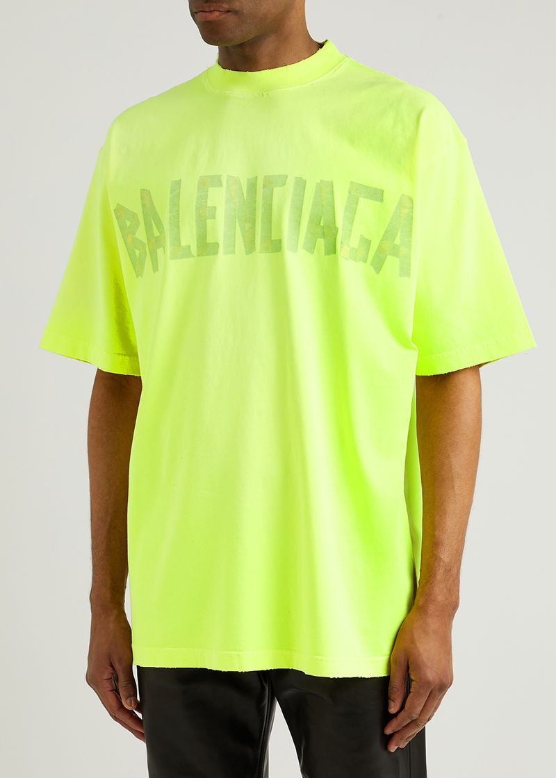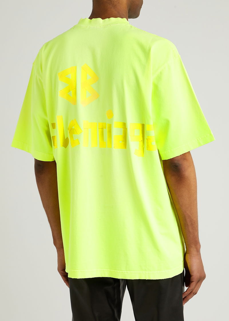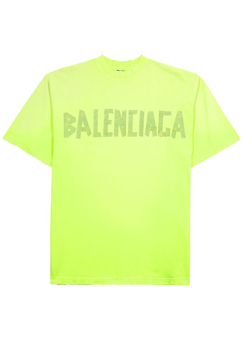 Balenciaga cotton T-shirt with a ribbed crew-neck, tape-effect logo print at front and back, distressed details and dropped shoulders.