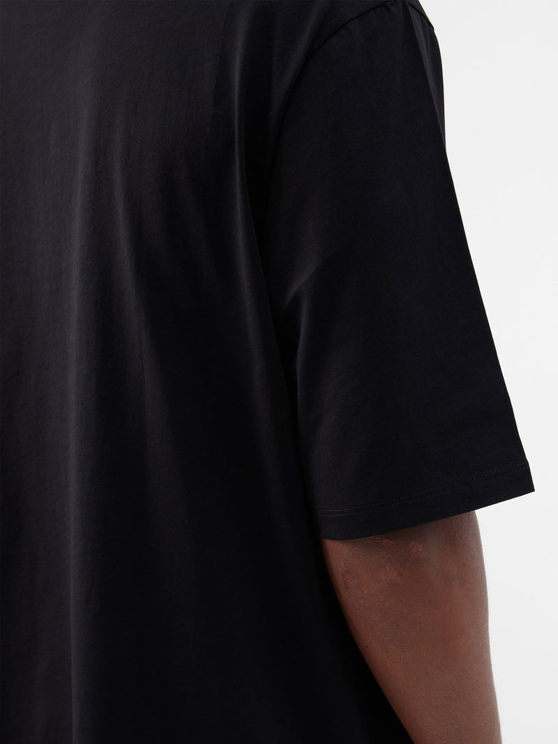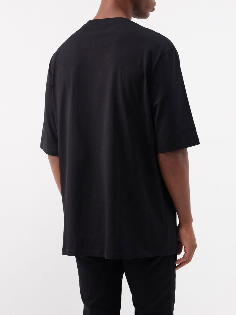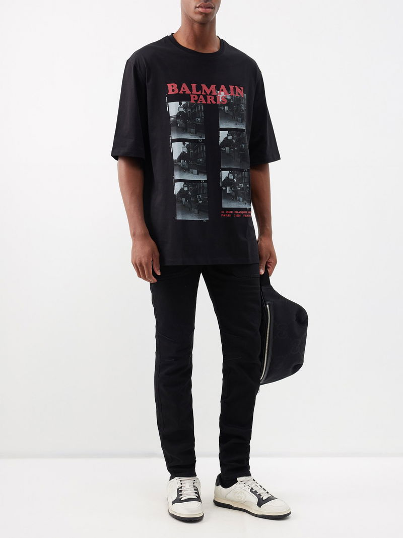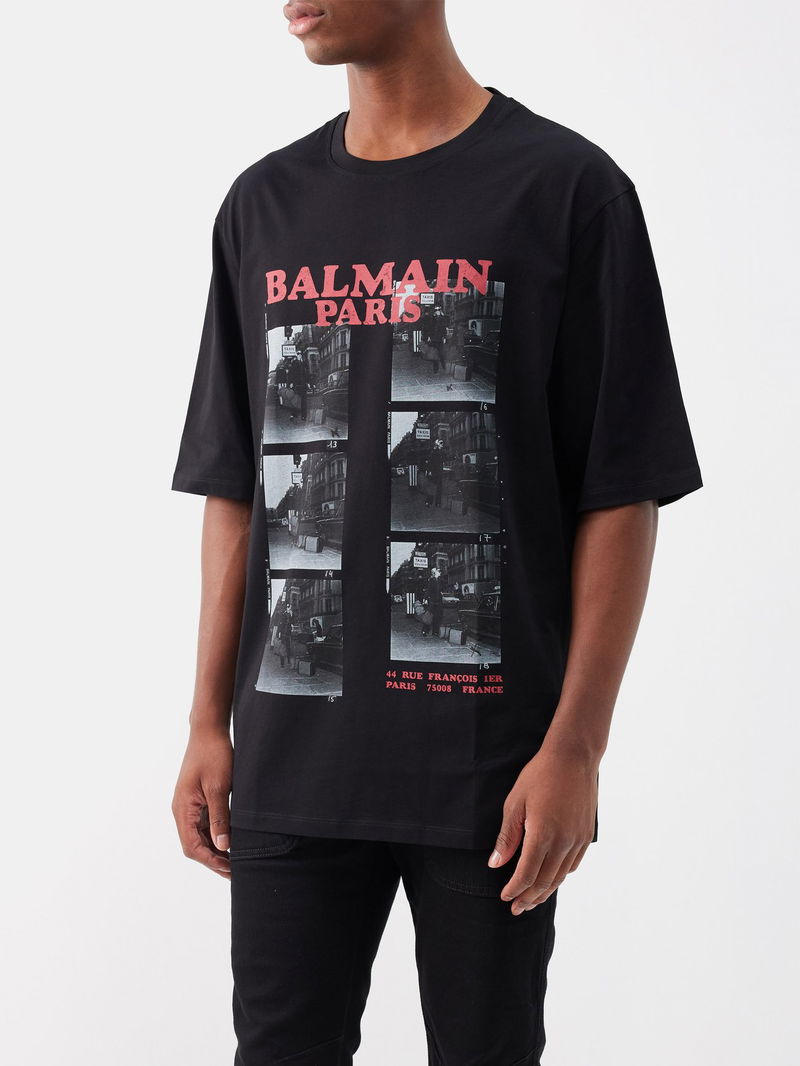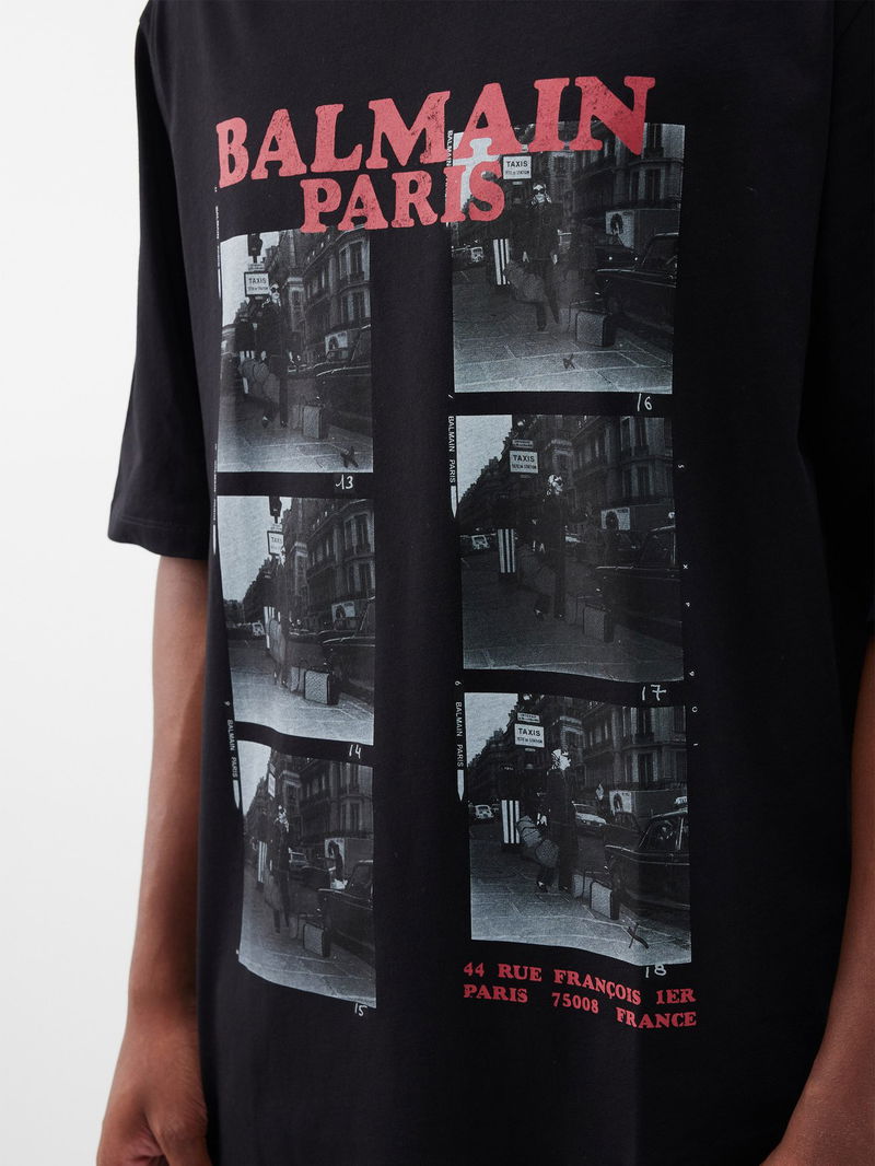 Balmain’s black T-shirt is cut from GOTS-certified organic cotton jersey with a photo print, referencing the label’s first atelier in 1944 on Paris’ Rue François.