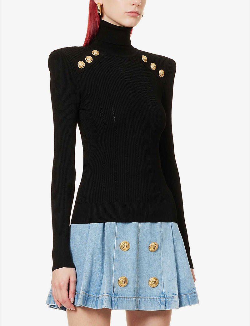 When we say Balmain, what comes to mind? Well, if you’re anything like us, you’ll picture a string of bronzed buttons scattered atop a structured style – that’s where this jumper comes in. Knitted with some stretch, it’s padded at the shoulders, comes up high on the neck and is complete with a handful of those gold-tone military buttons at the shoulders. Now all it needs is a leather mini and knee-high boots, we reckon.