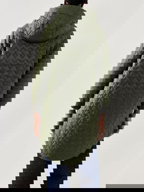 Quilted design Contrast spread collar Press-stud placket Side pockets Logo embroidery Regular fit.