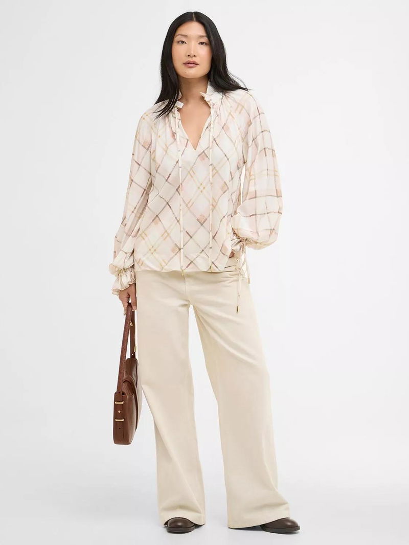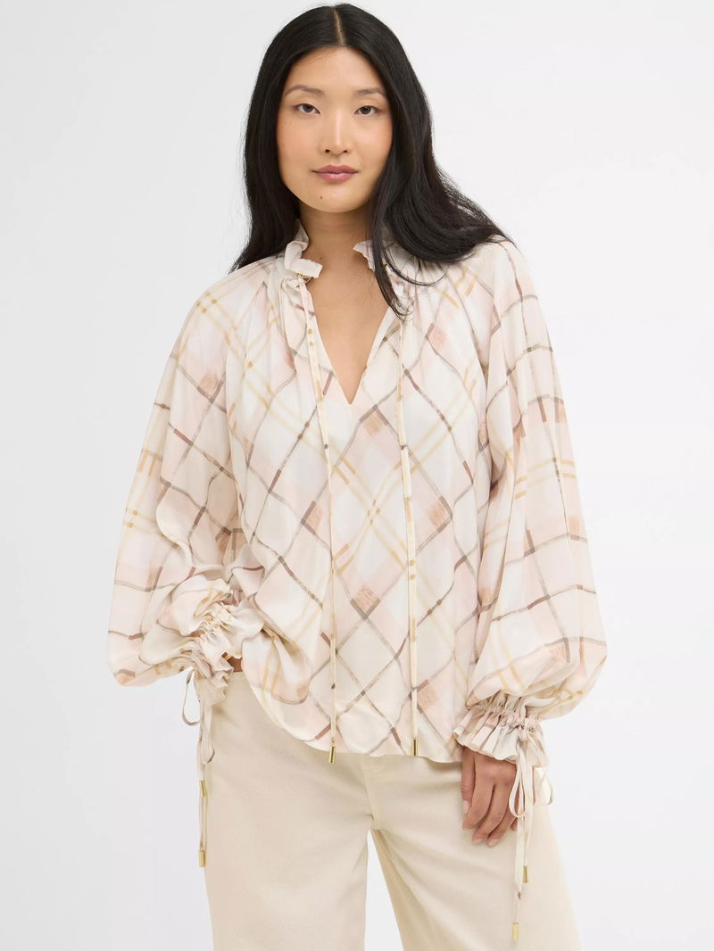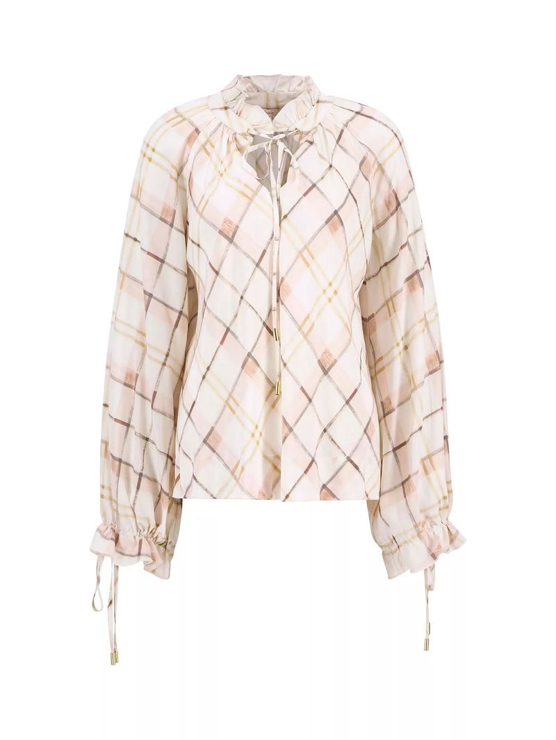 Asker Check Ruffle Neck Top, Silver Peony
