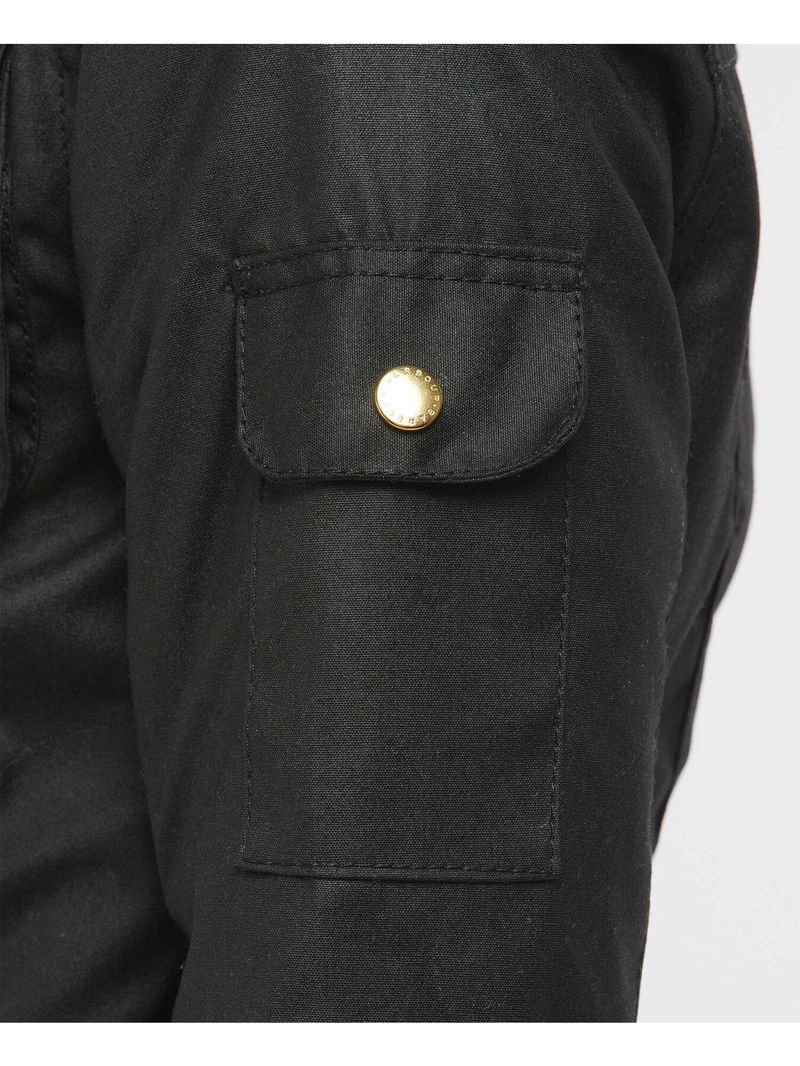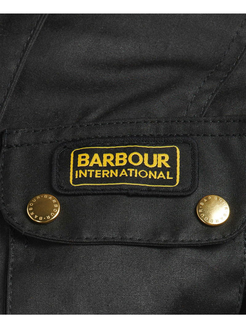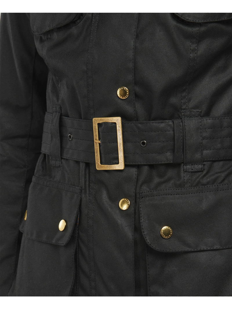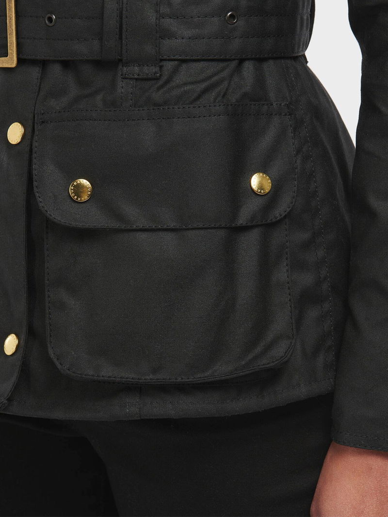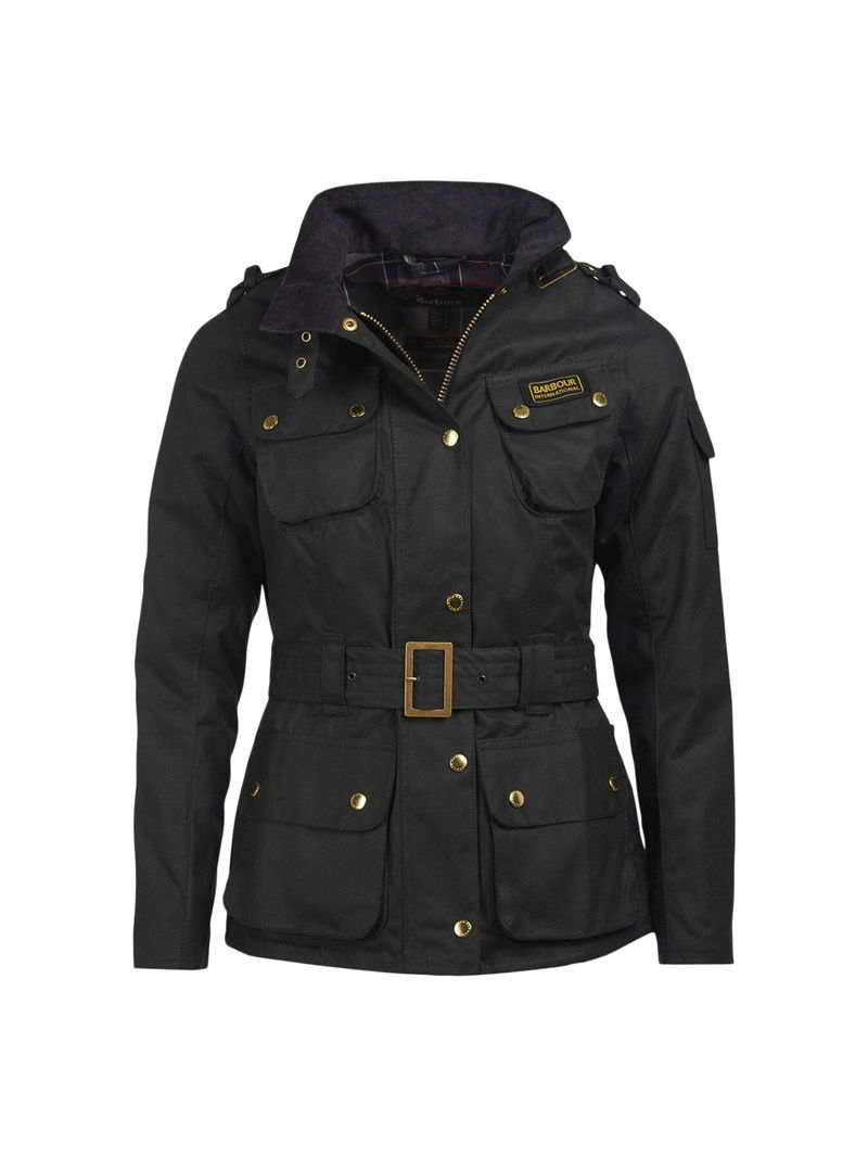 Product Details Inspired by Barbour International's rich heritage in motorcycle clothing, the Ladies' International reworks the iconic biker-style jacket for a feminine silhouette. Showcasing a belt to the waist for a flattering finish, this jacket boasts a four pocket design with an authentic buckle fastening to the neck.
