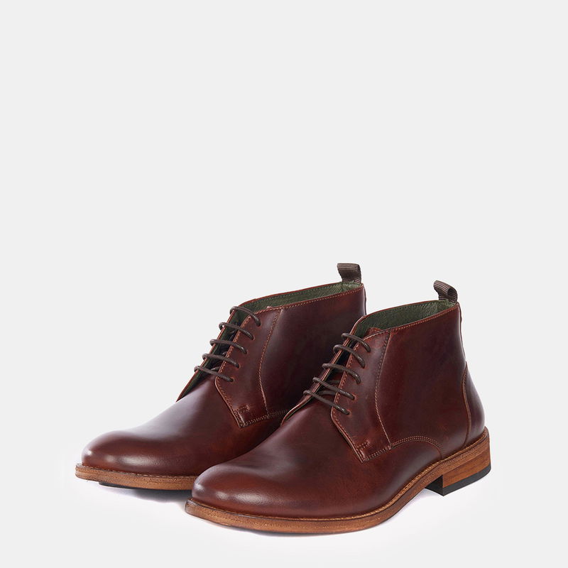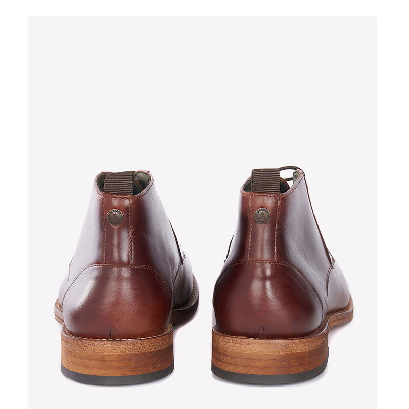 The Barbour Benwell is a lace-up chukka boot with a smooth-leather upper and a branded outsole featuring a rivet detail. Barbour's Classic Tartan appears inside this distinctive pair.