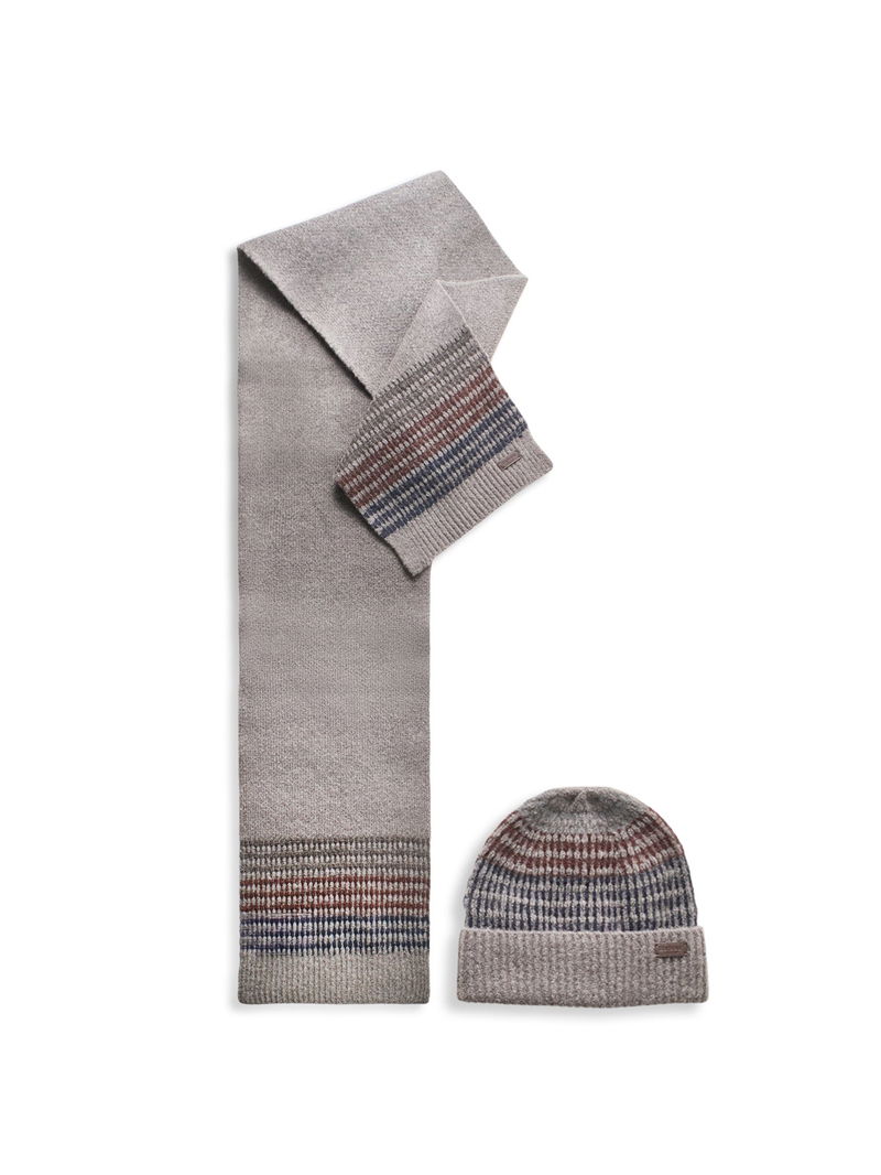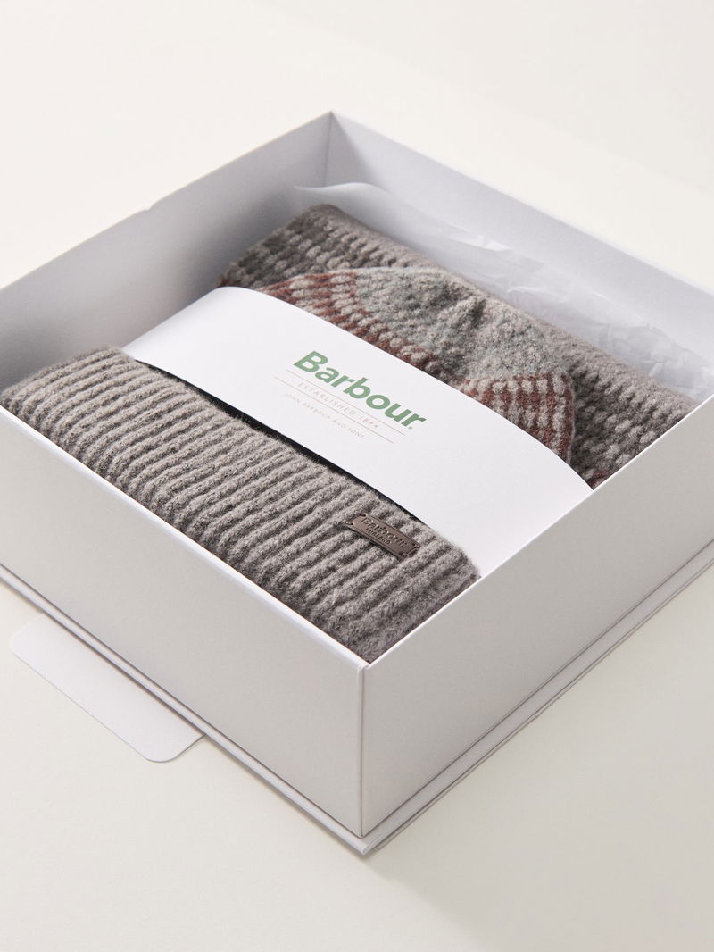The Branton Gift Set by Barbour pairs a knitted beanie and scarf in a midnight and oak mix. Crafted from a soft wool blend, it offers warmth and subtle texture - a perfect gift for the season ahead.