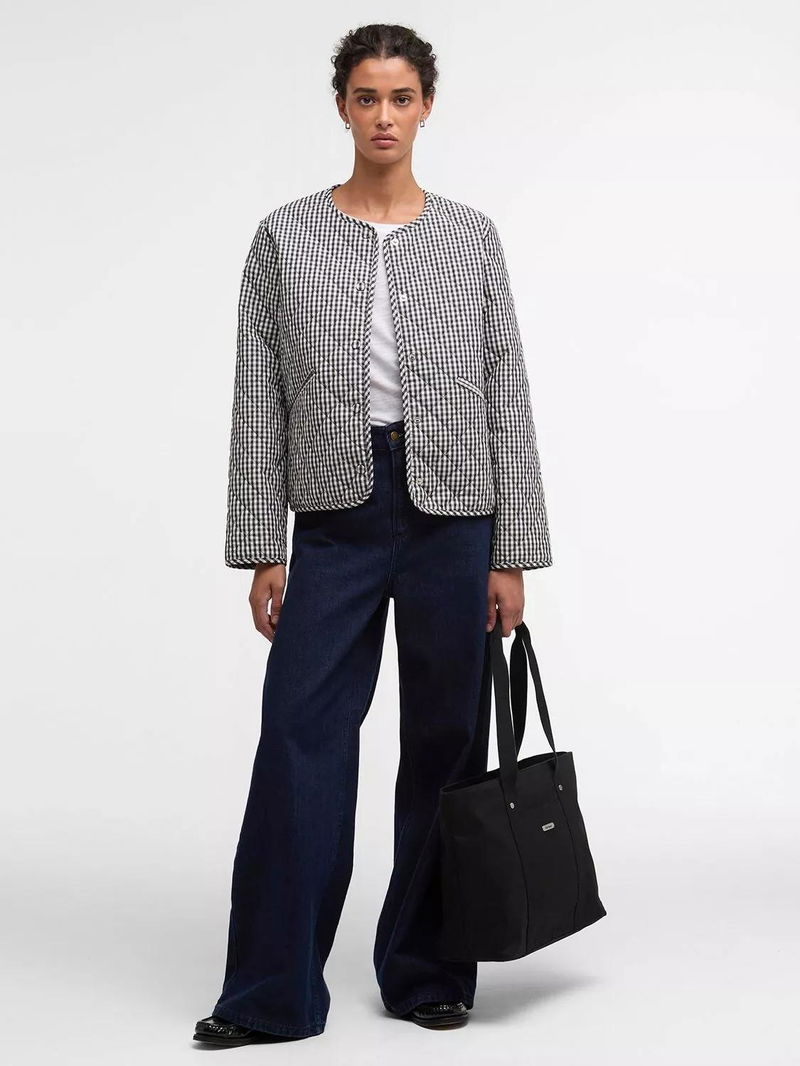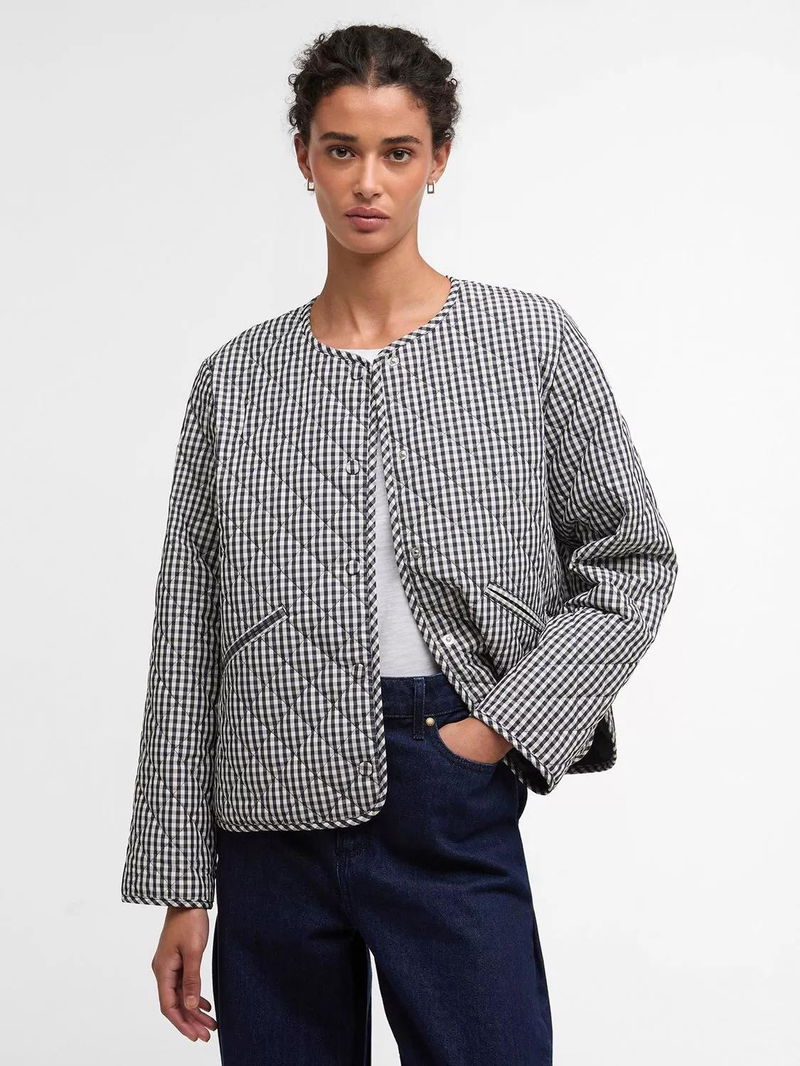 The Barbour Cashel Gingham Collarless Quilted Jacket is a lightweight, versatile layer perfect for transitional weather. Crafted with a short box quilt layered over seasonal tartan, it offers warmth without bulk.