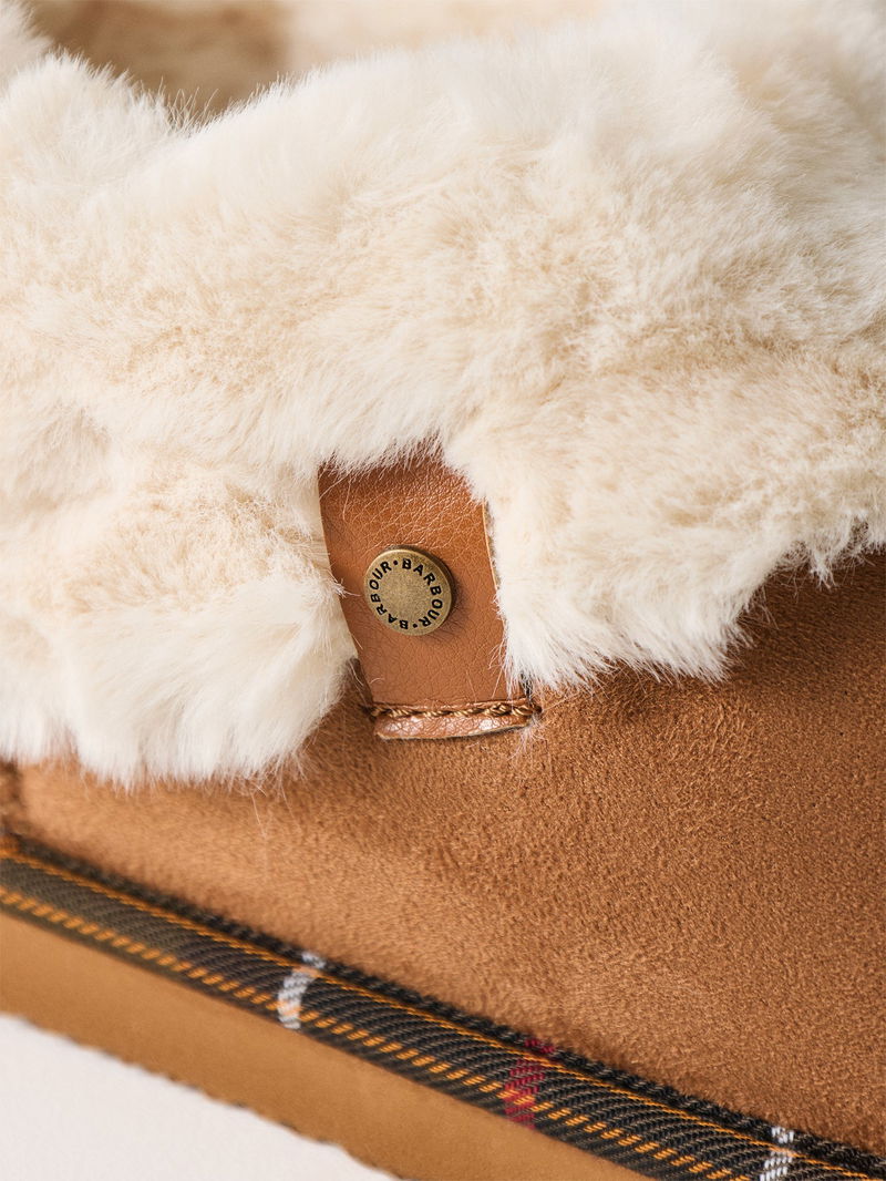 The Eloise Bootie Slippers by Barbour are crafted from sumptuously soft faux fur and lined for warmth. Featuring a turn-down cuff and branded sole, they capture the label’s signature blend of comfort and British country style.