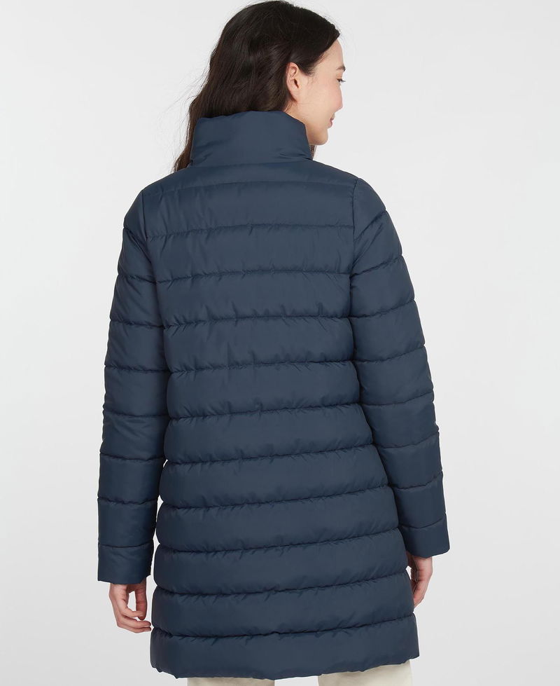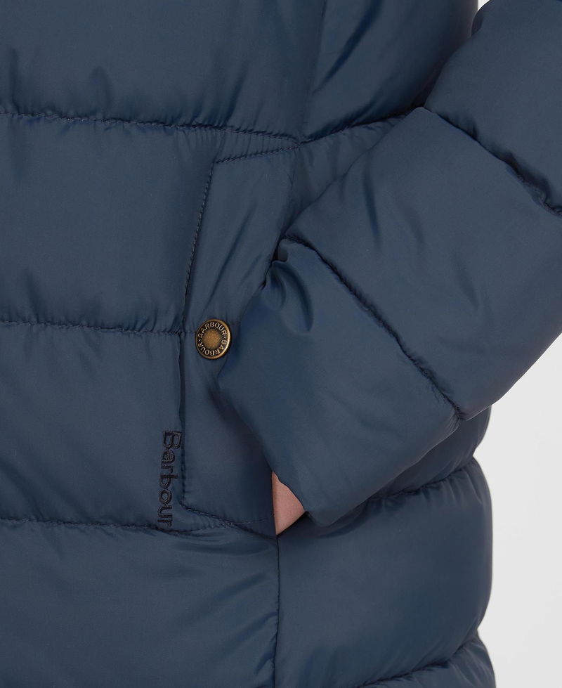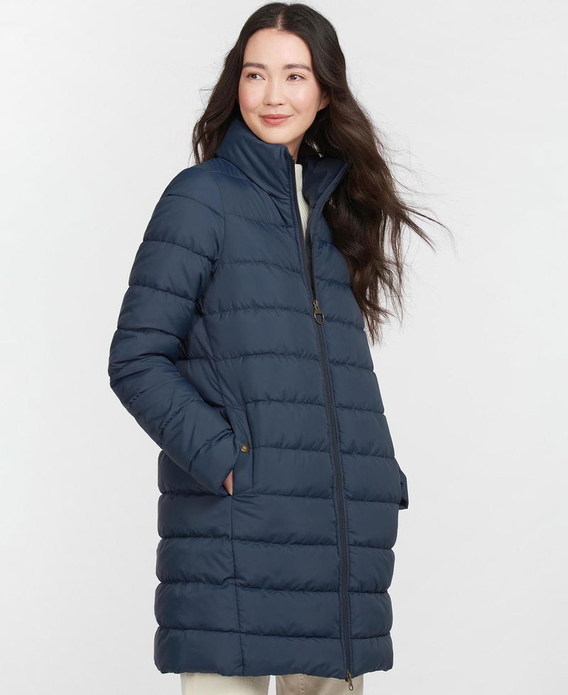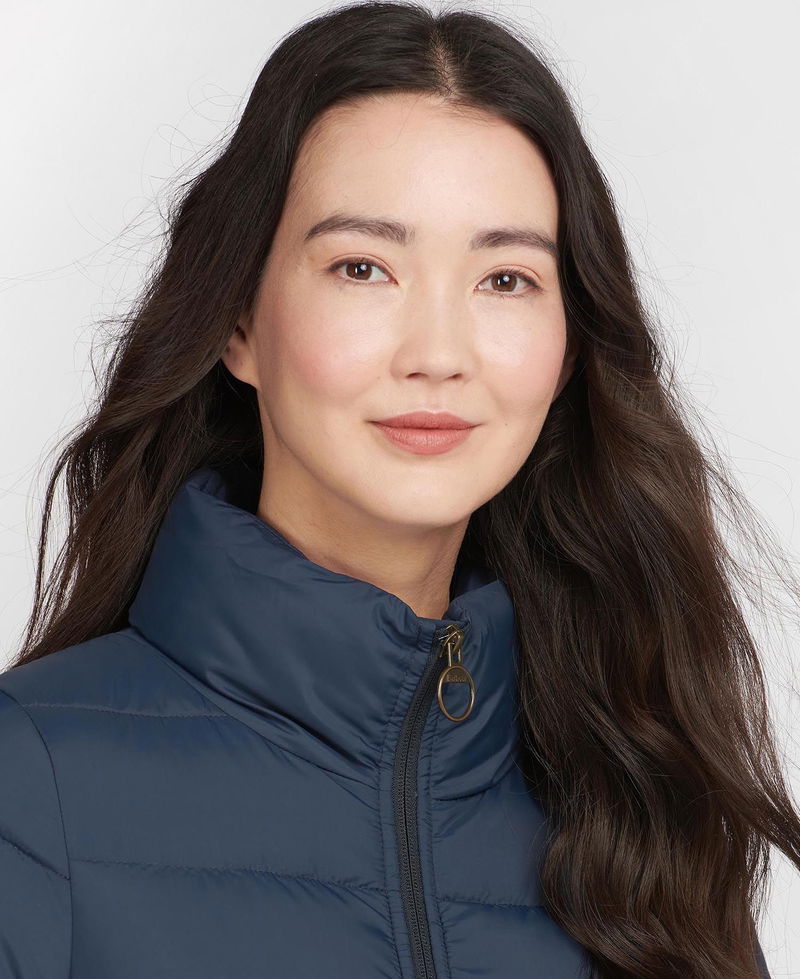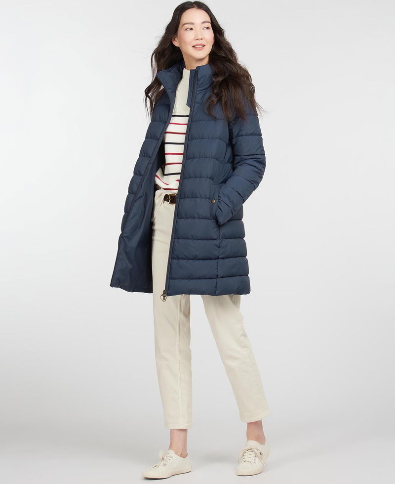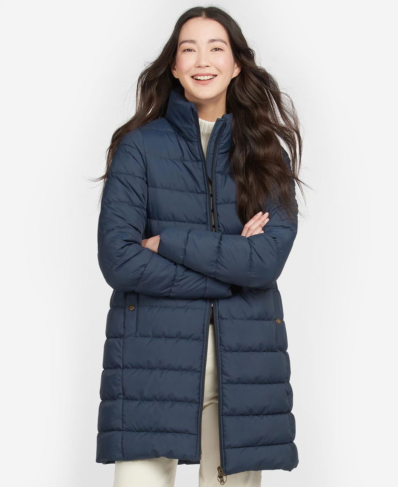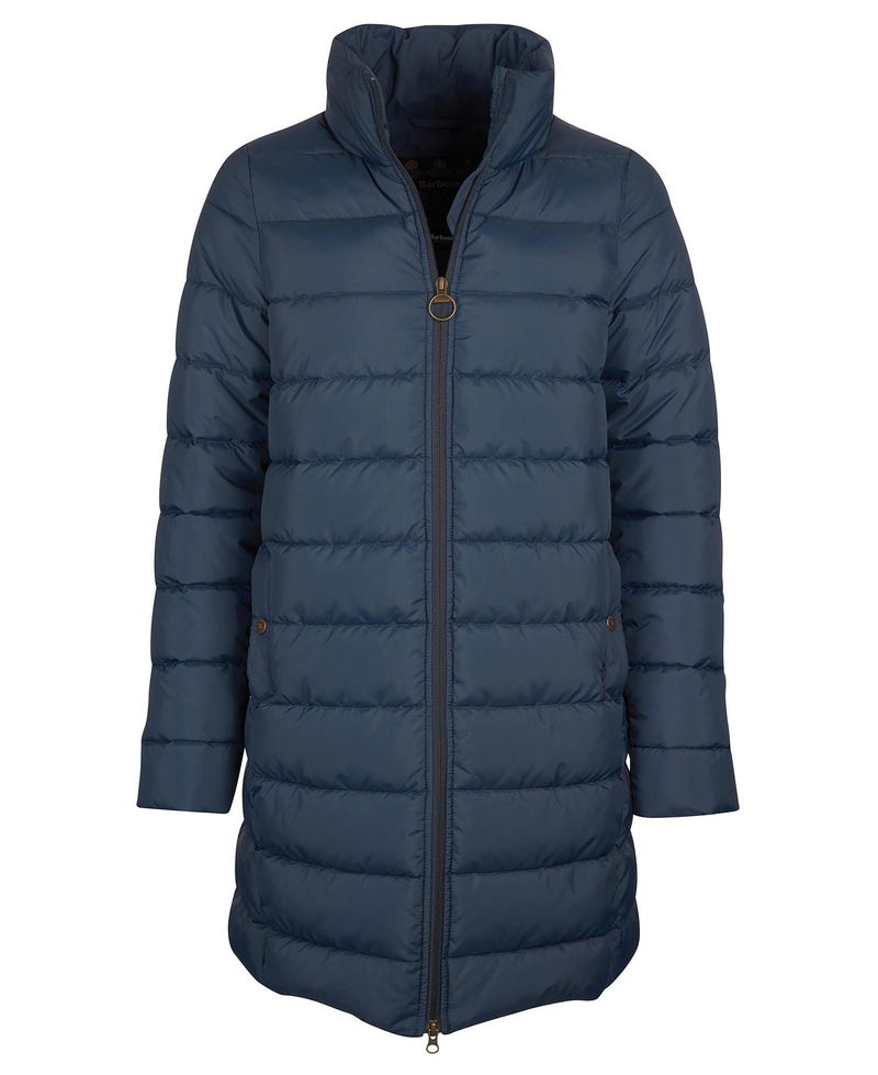 The Barbour Filwood quilted jacket features a longer length style in an all over baffle design. Perfect for cool walks, this jacket features studded pocket detail and is finished with a Barbour embroidery on the pocket.