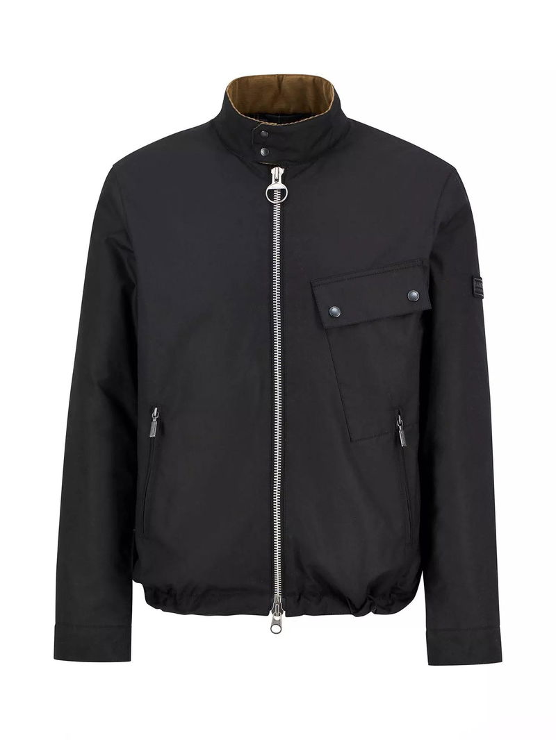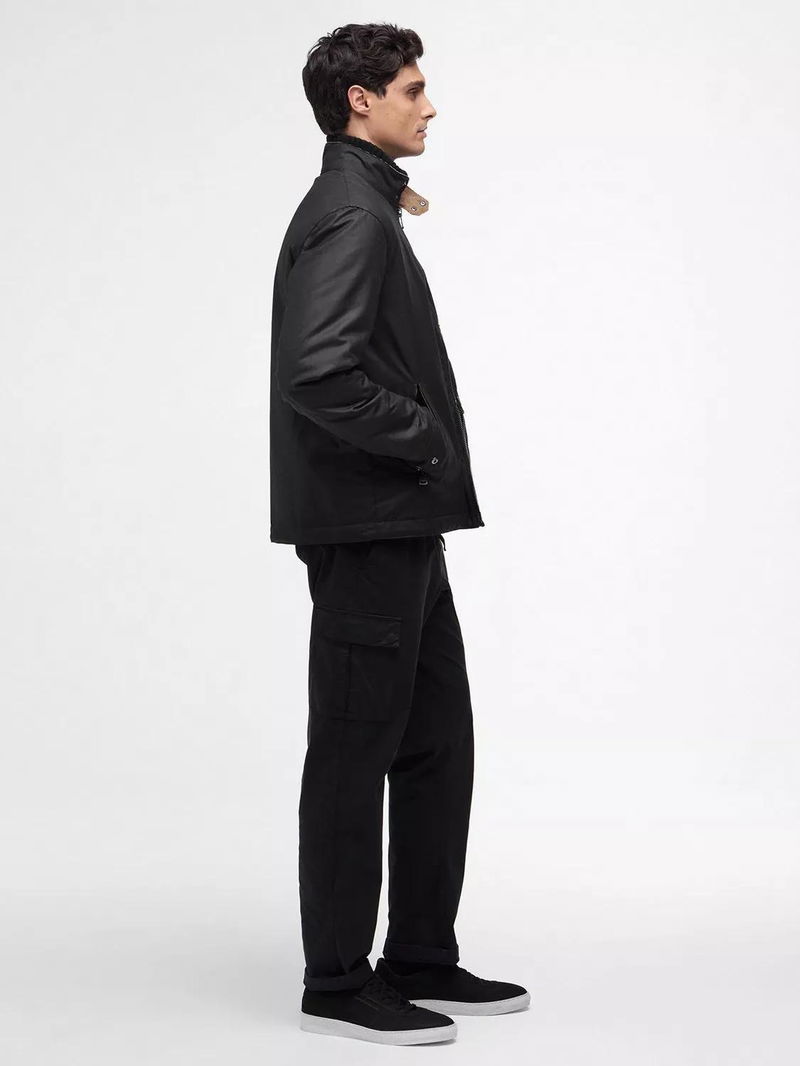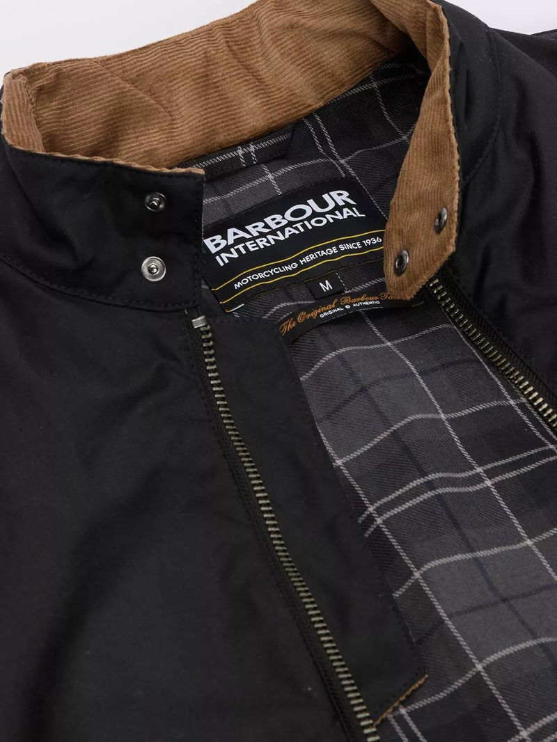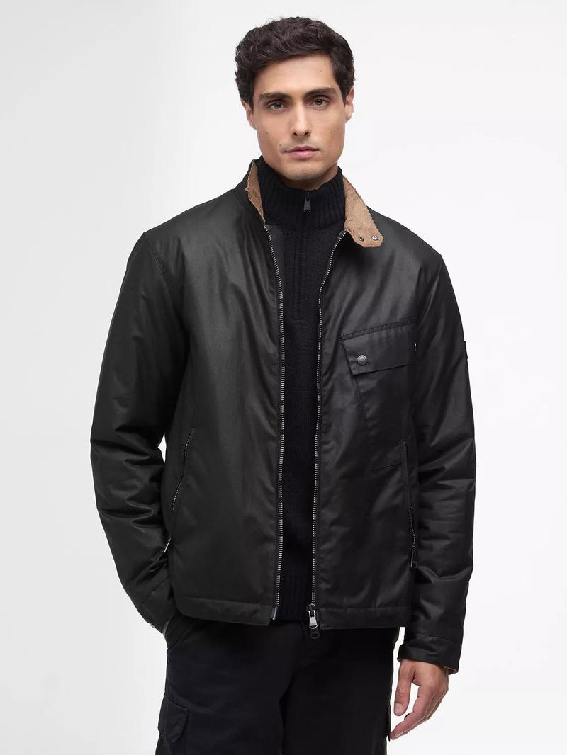 The Chard Waxed Jacket, made from 6oz waxed cotton, features a stand collar, angled map pocket, and lower zip pockets, with needlecord trims and a tartan lining.