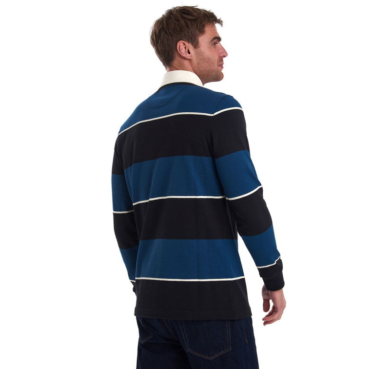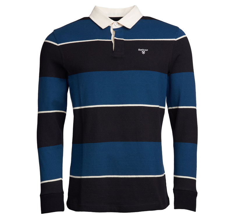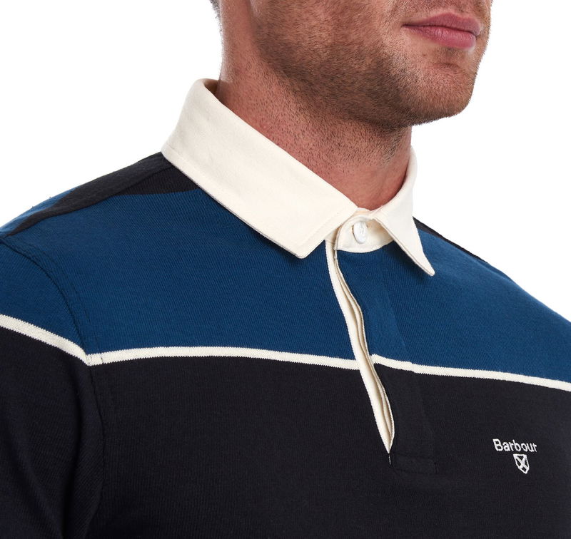 This authentic rugby shirt is created in single-jersey cotton and features a distinctive three-colour stripe. A concealed placket fastens through to a contrast twill collar, while ribbed cuffs and Barbour shield embroidery at the chest complete the look.