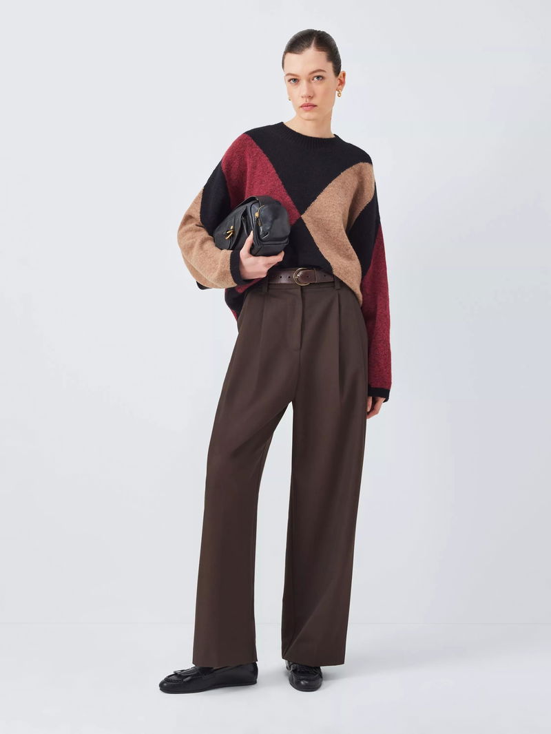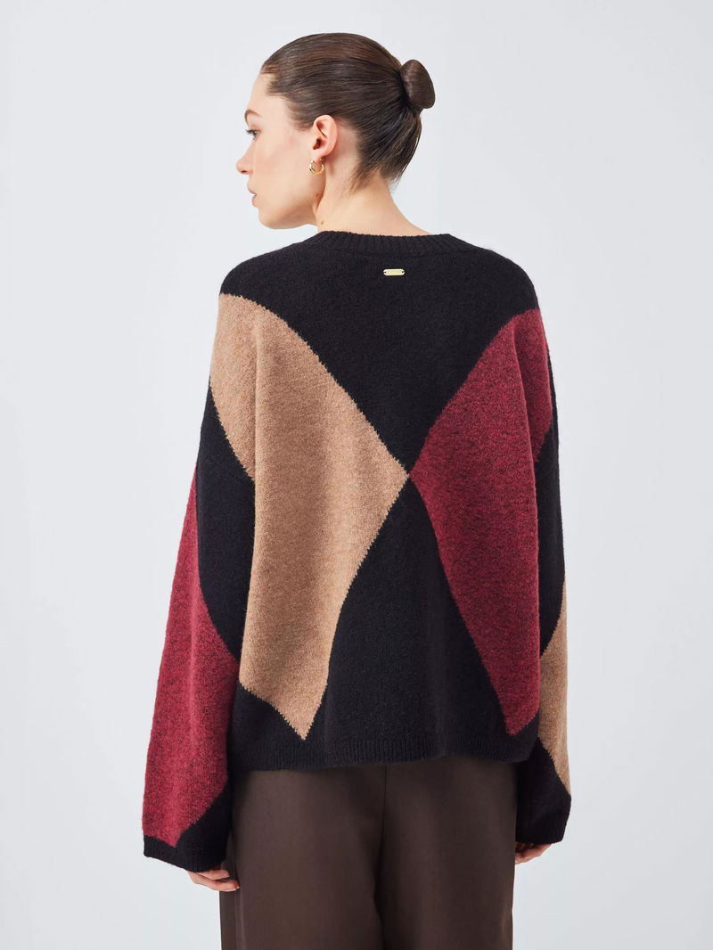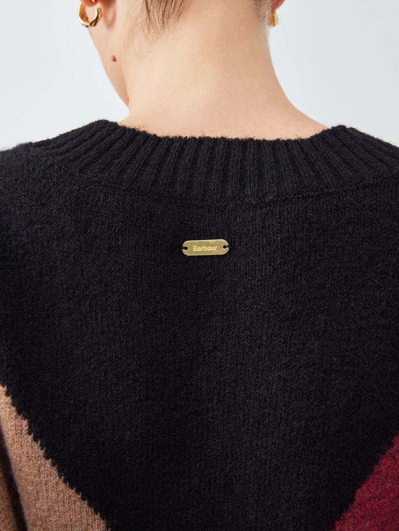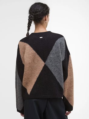 Make a statement in style with the Barbour Sabrina jumper. Crafted from a premium wool-rich blend, this bold tri-colour, crew-neck jumper features a jumbo diamond design all in neutral colourways, making it an effortless styling option in the cooler months.
