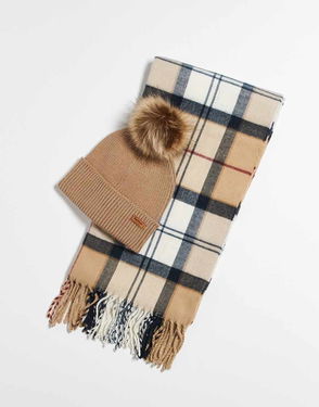 Lending itself to multiple styling options, this accessory gift set includes a tartan boucle scarf and a Barbour Saltburn beanie hat. The hat has a chunky ribbed knit structure with faux-fur pom-pom adding a feminine touch. This set is presented in a branded gift box.