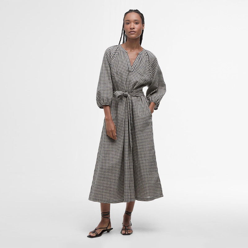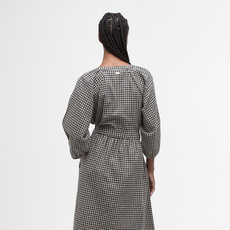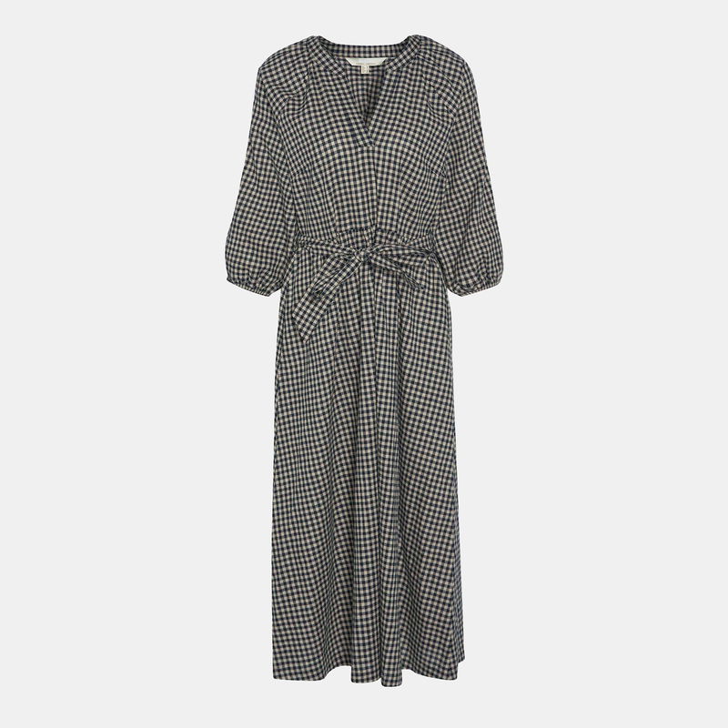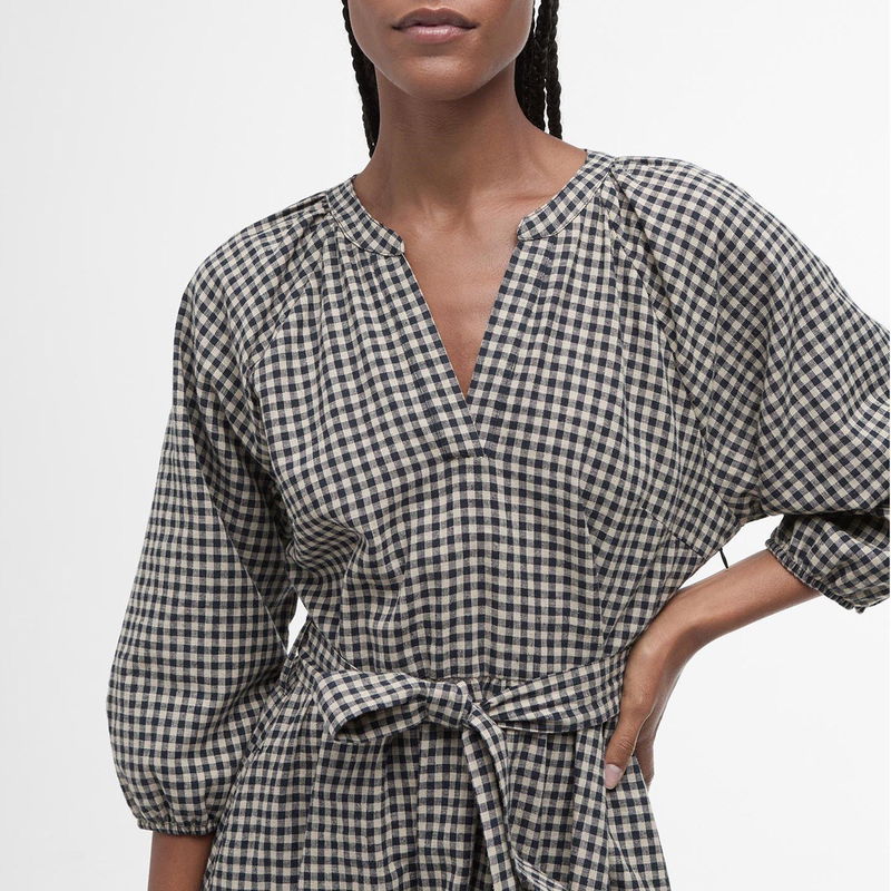 The Barbour Suri Midi Dress effortlessly blends sophistication with modern style. Featuring a flattering V-neckline and three-quarter length sleeves, this dress is designed to turn heads. The matching self-tie waist belt cinches the silhouette, creating a flattering shape that adds elegance to every movement. Perfect for dressing up or down, this midi dress offers a versatile, fashion-forward piece that seamlessly transitions from day to night.