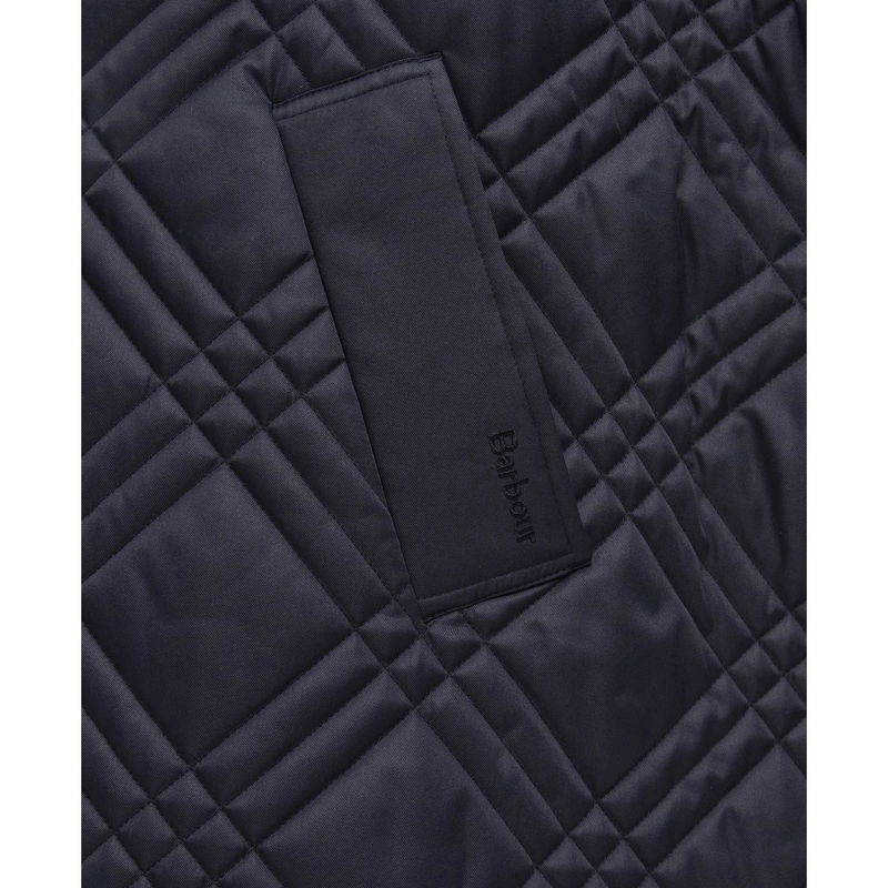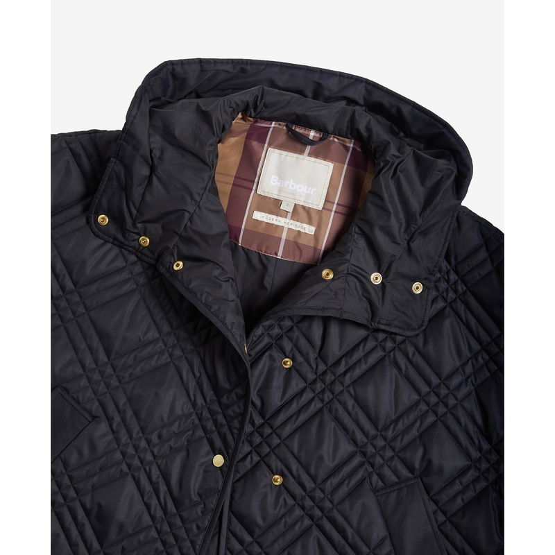 This outerwear piece features a tartan quilting pattern complemented by practical studded fastenings and open sides that accommodate winter layers.