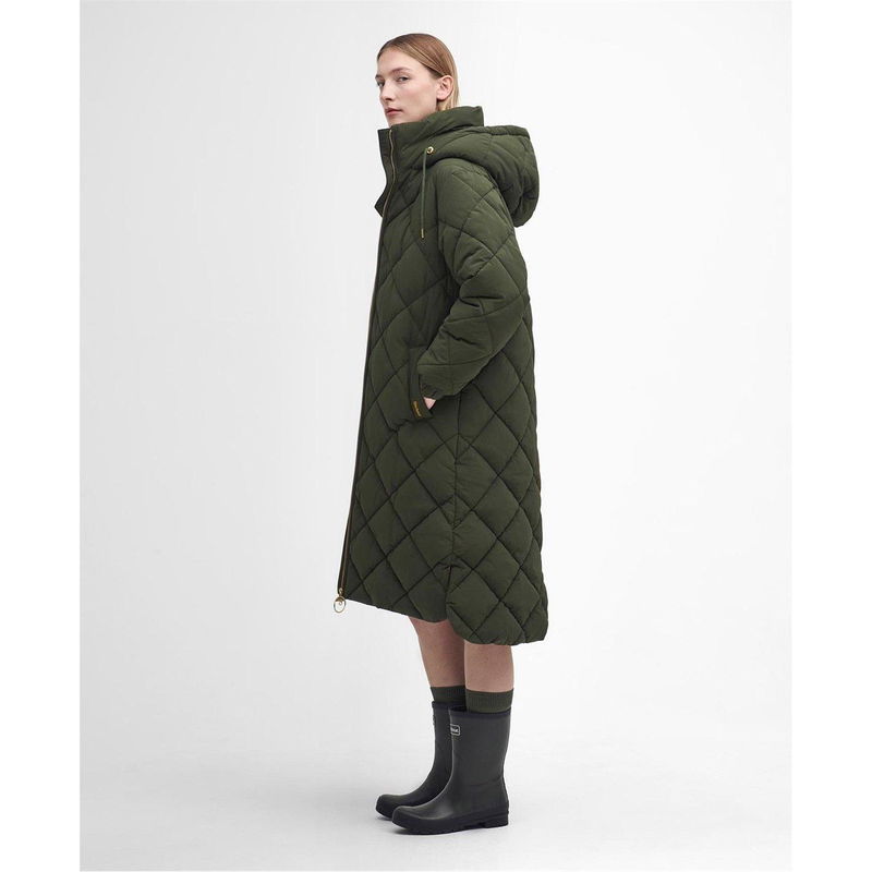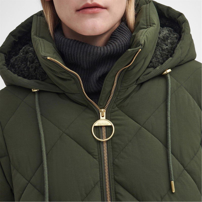 The Barbour Kirkton Diamond Quilted Hooded Long Puffer Jacket delivers warmth with heritage style. The diamond quilting wraps you in insulation while the oversized fixed hood provides extra coverage against the elements. This knee-length winter coat pairs a classic design with practical functionality for city-to-country wear.
