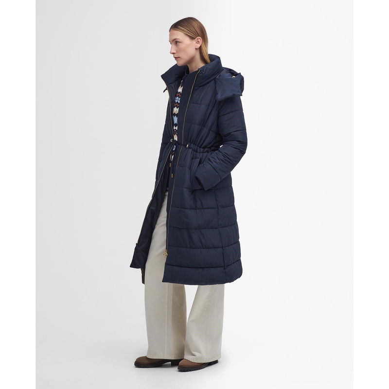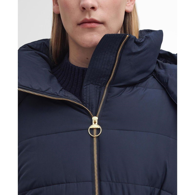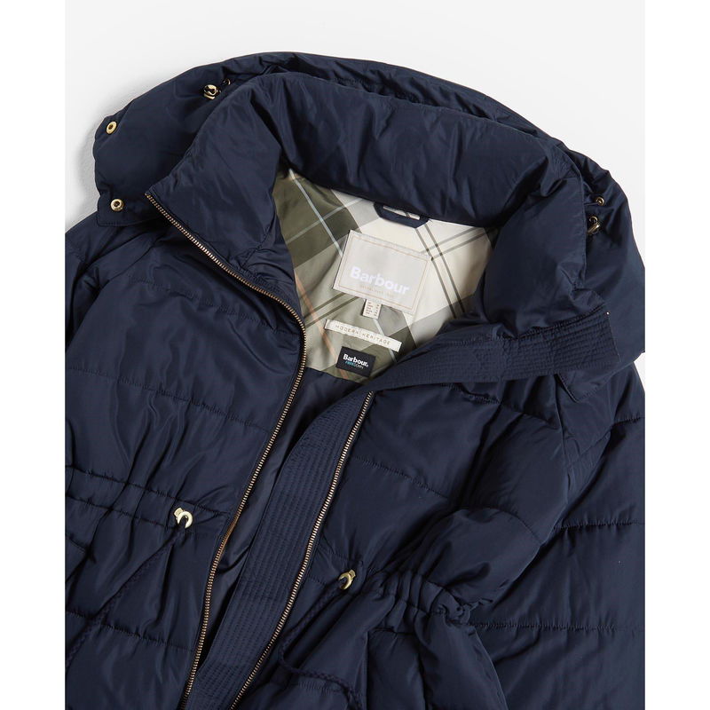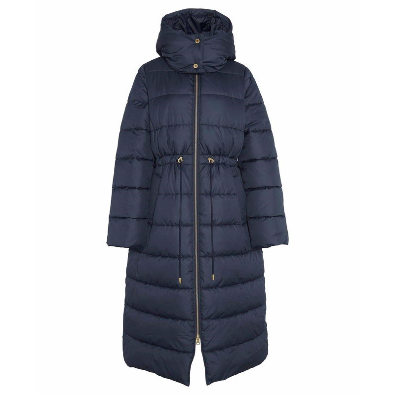Barbour's Women's Mannue Longline Quilted Jacket delivers warmth with its all-over baffle-quilted design and luxurious padding. The oversized hood provides cosy protection while the gold-tone zip fastening and adjustable drawstring waist create a modern, flattering shape.