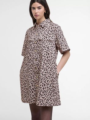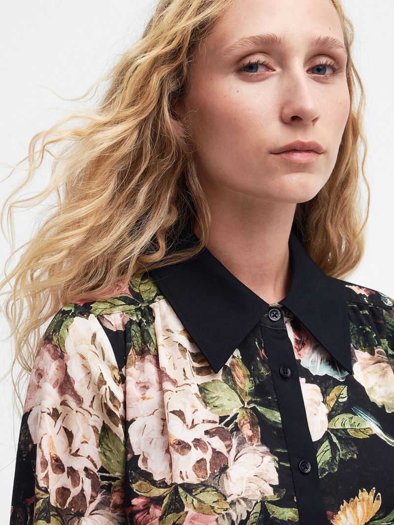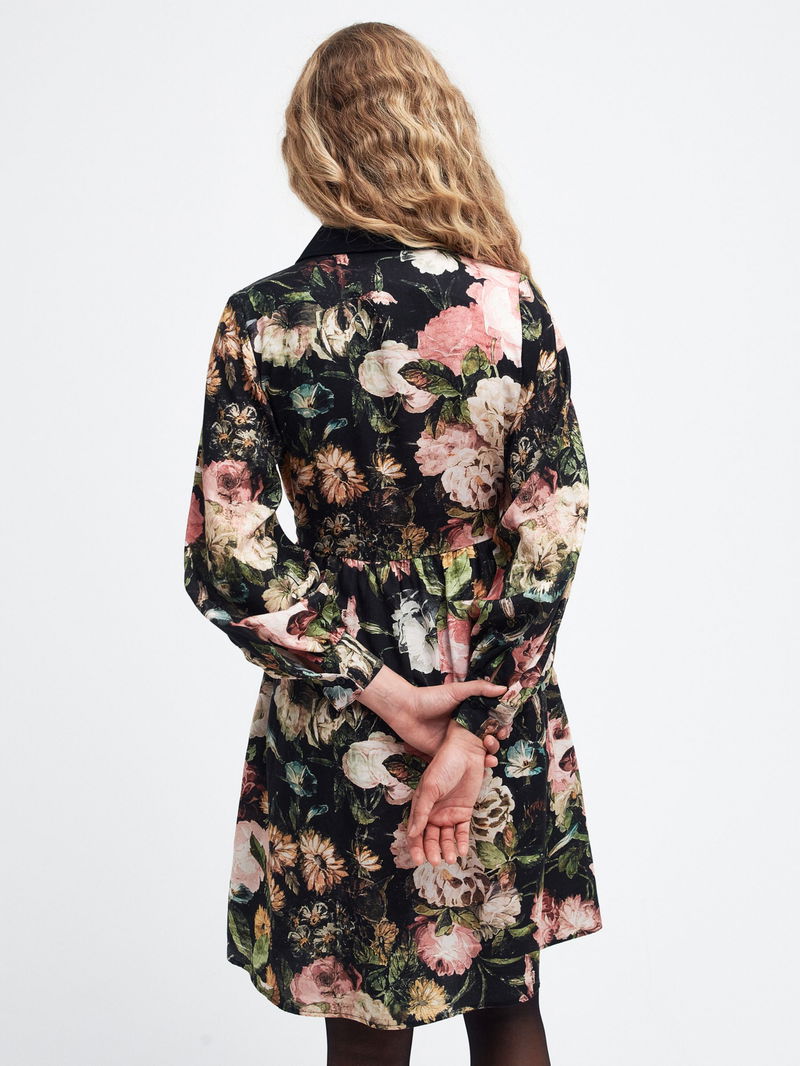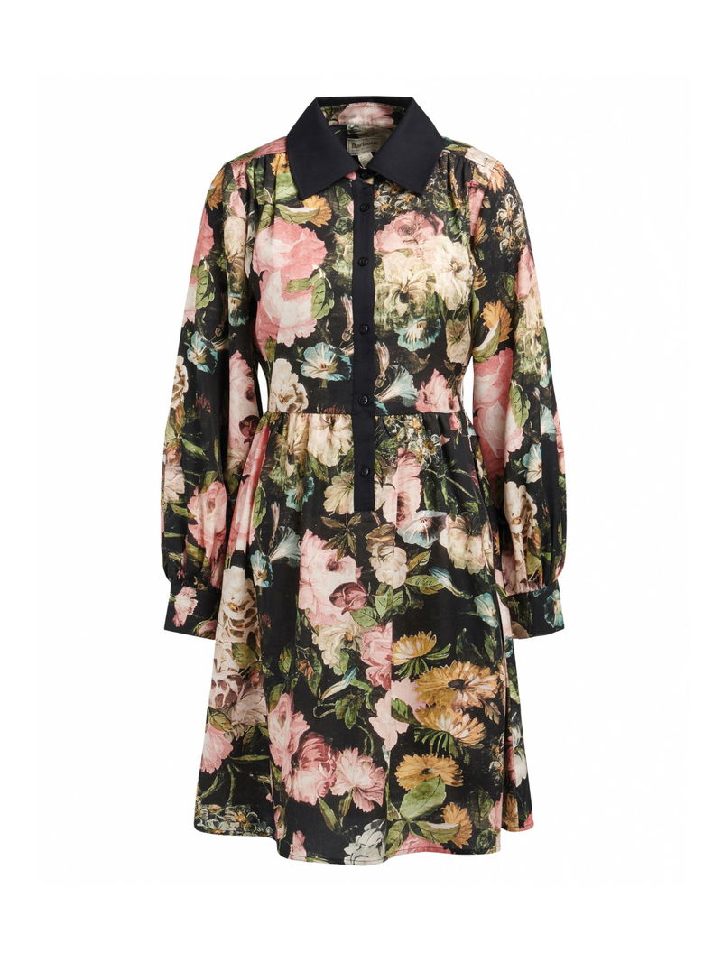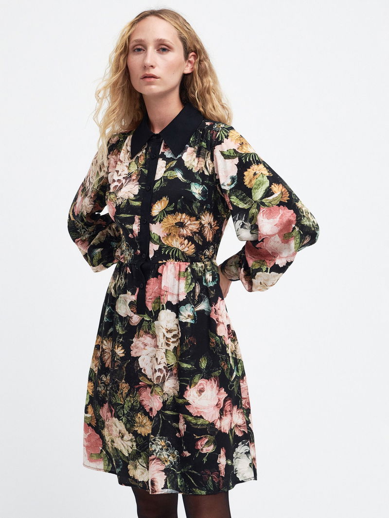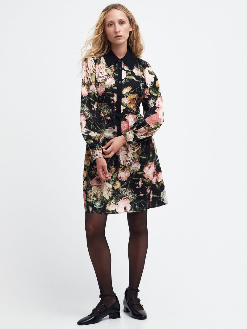 With a dramatic, winter-inspired floral blossoming throughout, this dress comes in a smart shirt style with colour block collar and button placket.