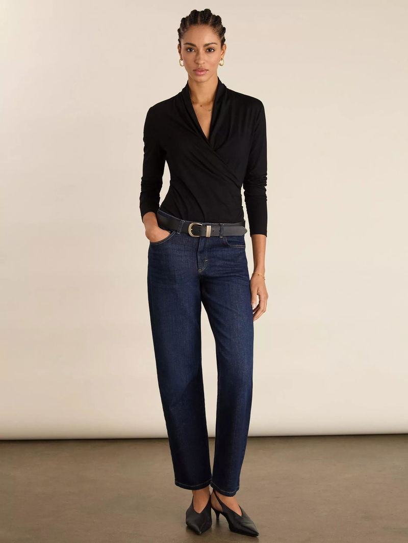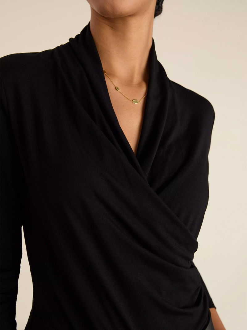 Look chic in comfort with the Gylda Wrap Top. This elegant style in black simply pulls on and comes with a fixed wrap feature. Made from our signature soft jersey, it drapes beautifully around the neckline and body, and is cut for a slim fit around the arms and waist. Effortlessly elegant, wear it to add a considered touch to trousers or jeans.