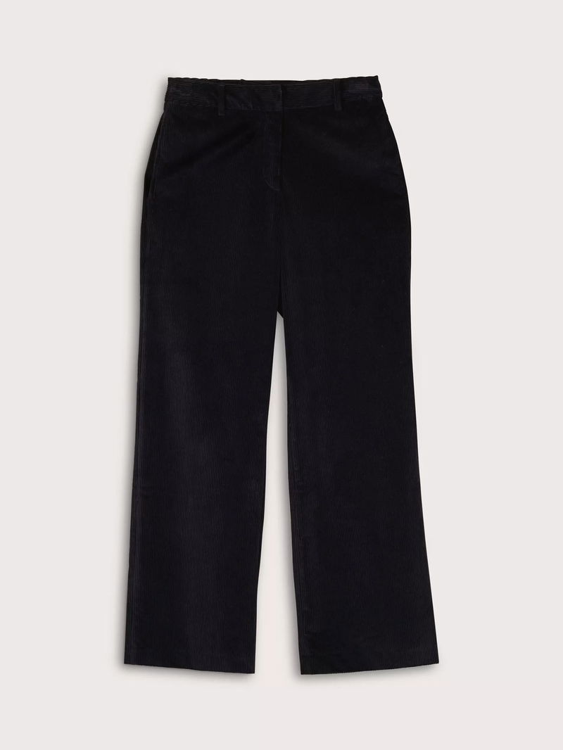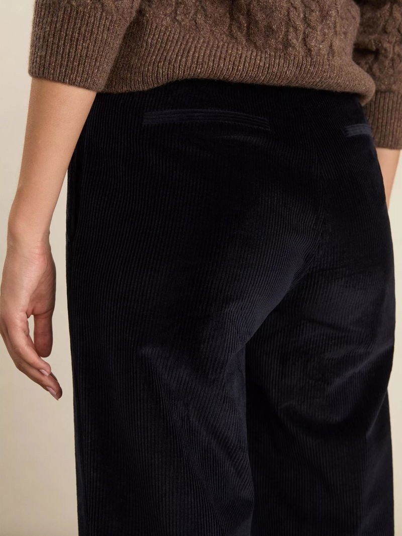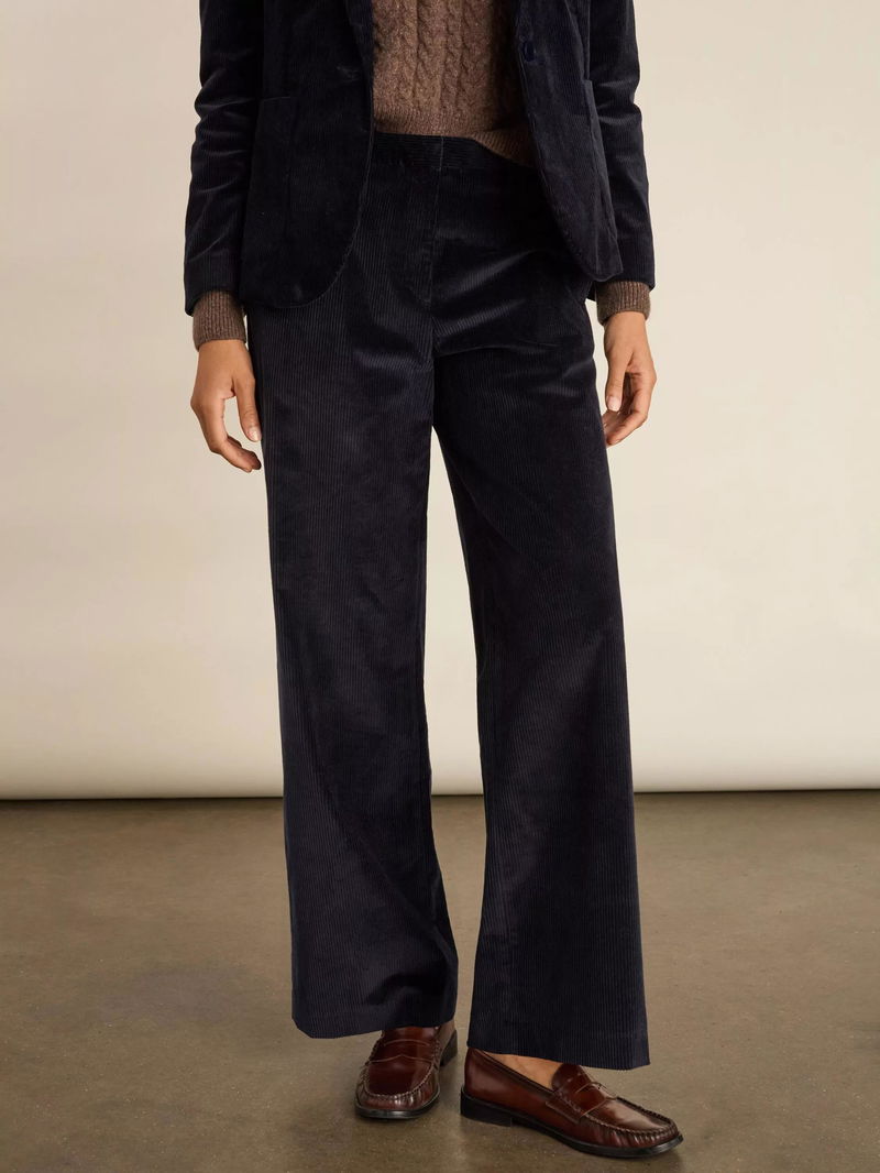 For tailored, versatile pants boasting warmth and texture, look no further than the Melis Corduroy Trousers in navy. This wide-leg style are crafted in organic cotton with stretch for comfort and have a simple, flat front.