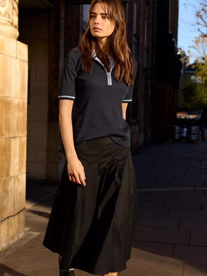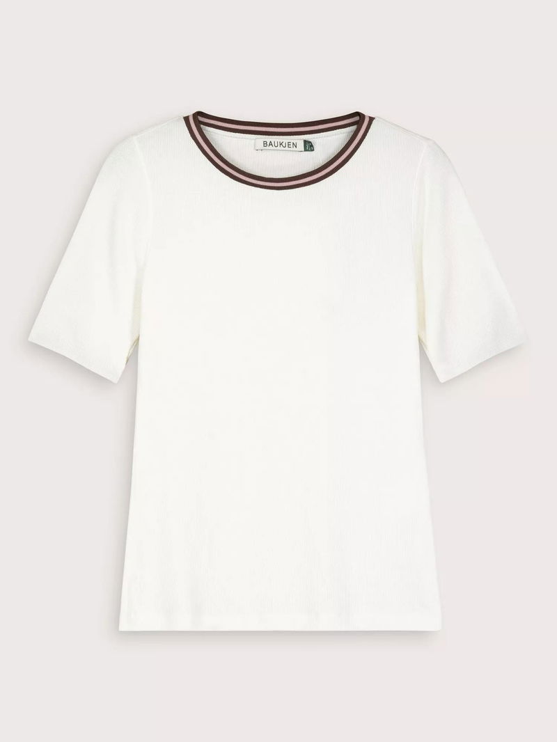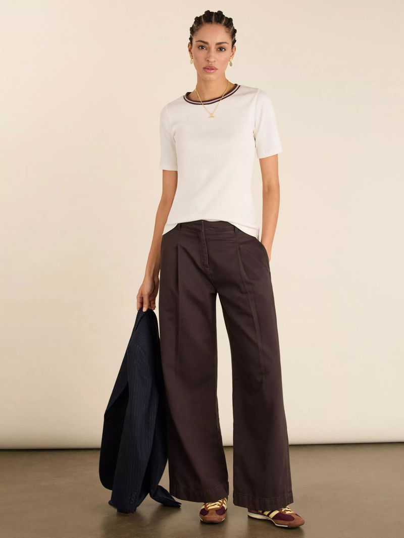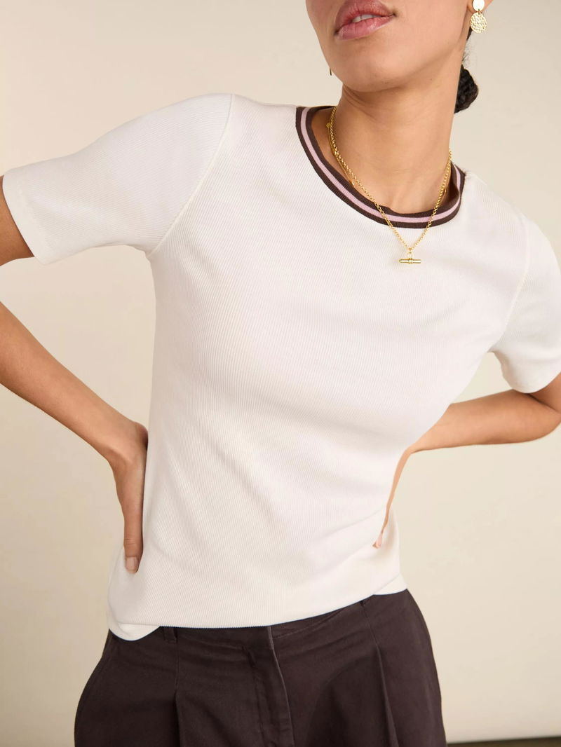 It's all in the detail with the Sylvie Tee: a neat crew neck top with sleeves which finish near the elbow. It's the subtle striped edging around the collar that adds a nod to the retro sports trend. Crafted in soft cotton rib jersey, it's cut for a slim fit. A dependable staple with just enough difference. Sylvie can be worn on its own but is equally handy for layering.