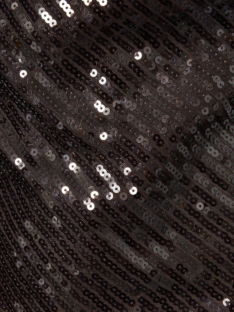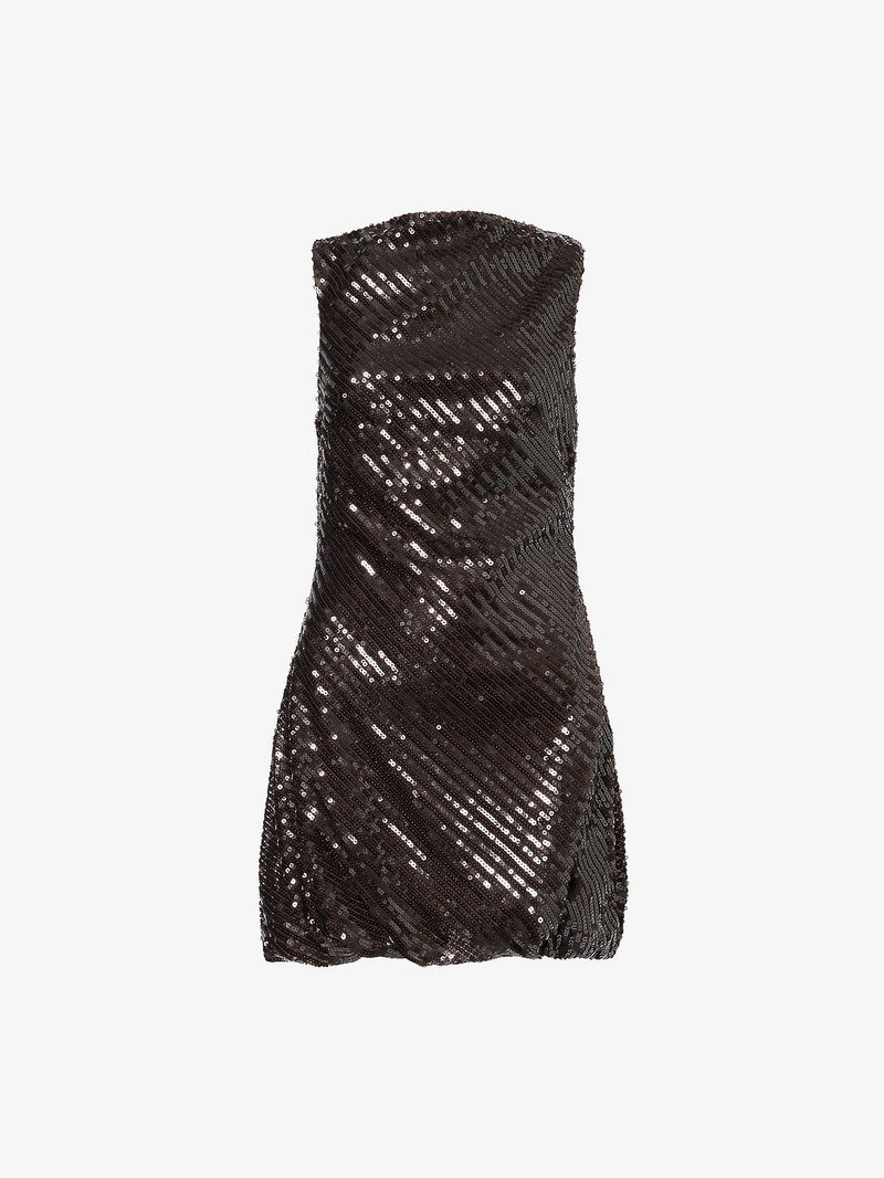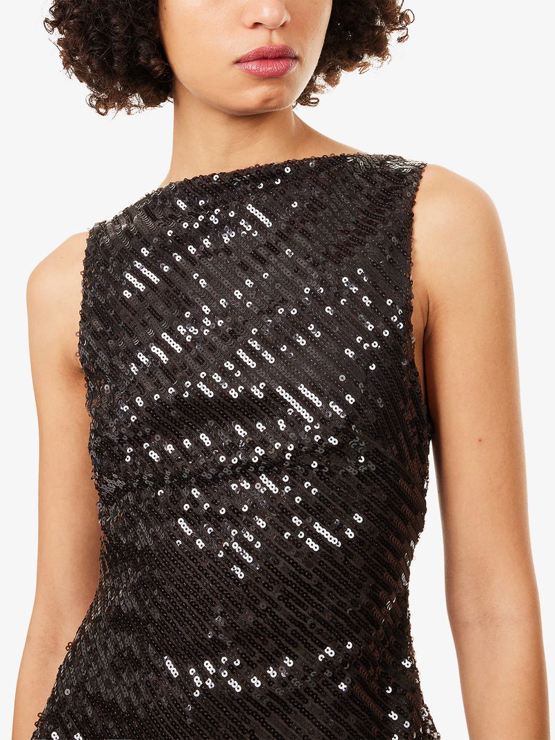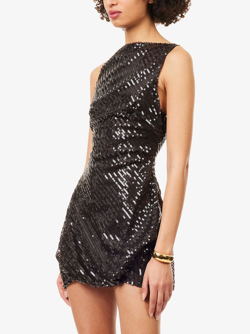 Bec + Bridge woven mini dress. Slim fit, cowl-neck, sleeveless, open at back, all-over sequin embellishment, all-over mesh texture, fully lined, puffball hem.