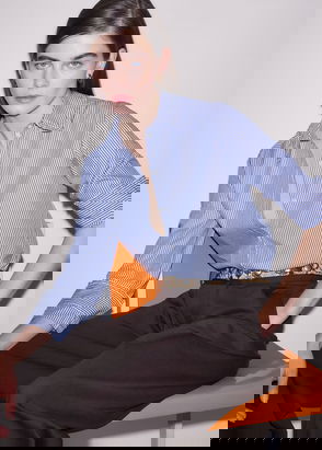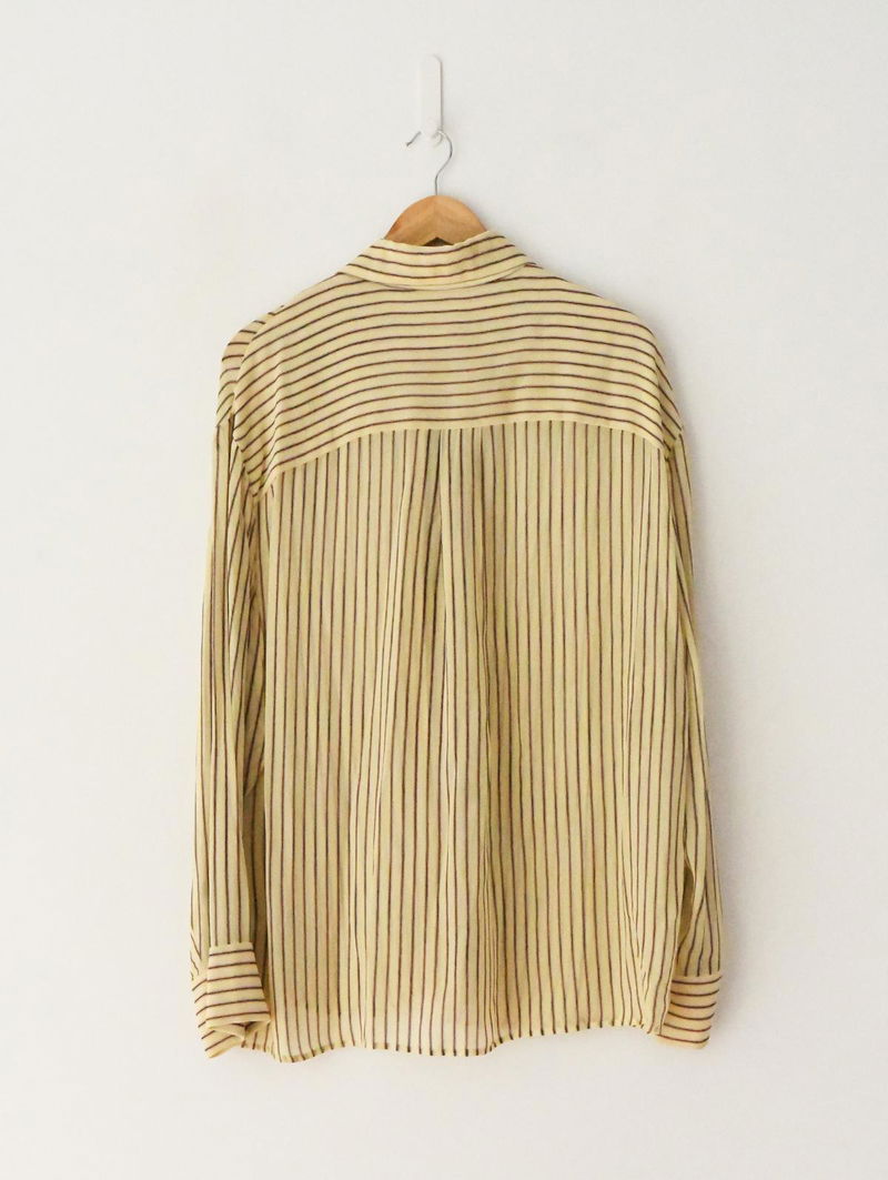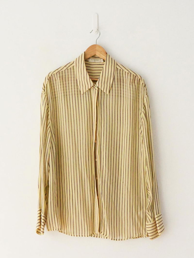 Cream and Purple Sheer Stripe button through shirt. Cuffed Sleeves.