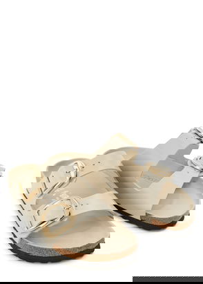 Birkenstock metallic silver leather sliders. Adjustable buckle-fastening straps, designer stamp at side, designer-engraved silver-tone hardware, contoured cork footbed, EVA sole, open toe. Slip-on.