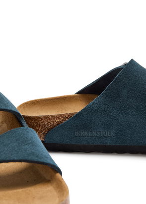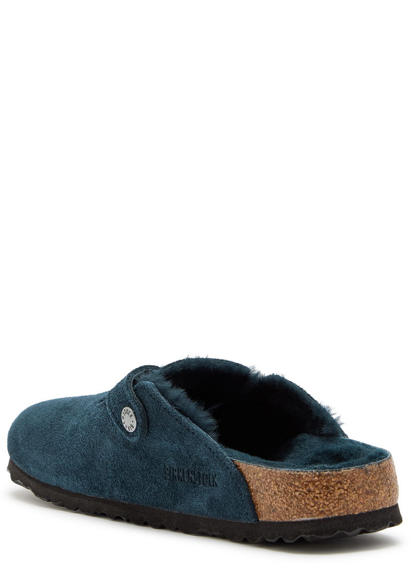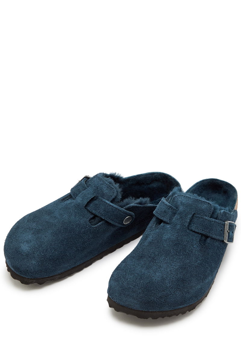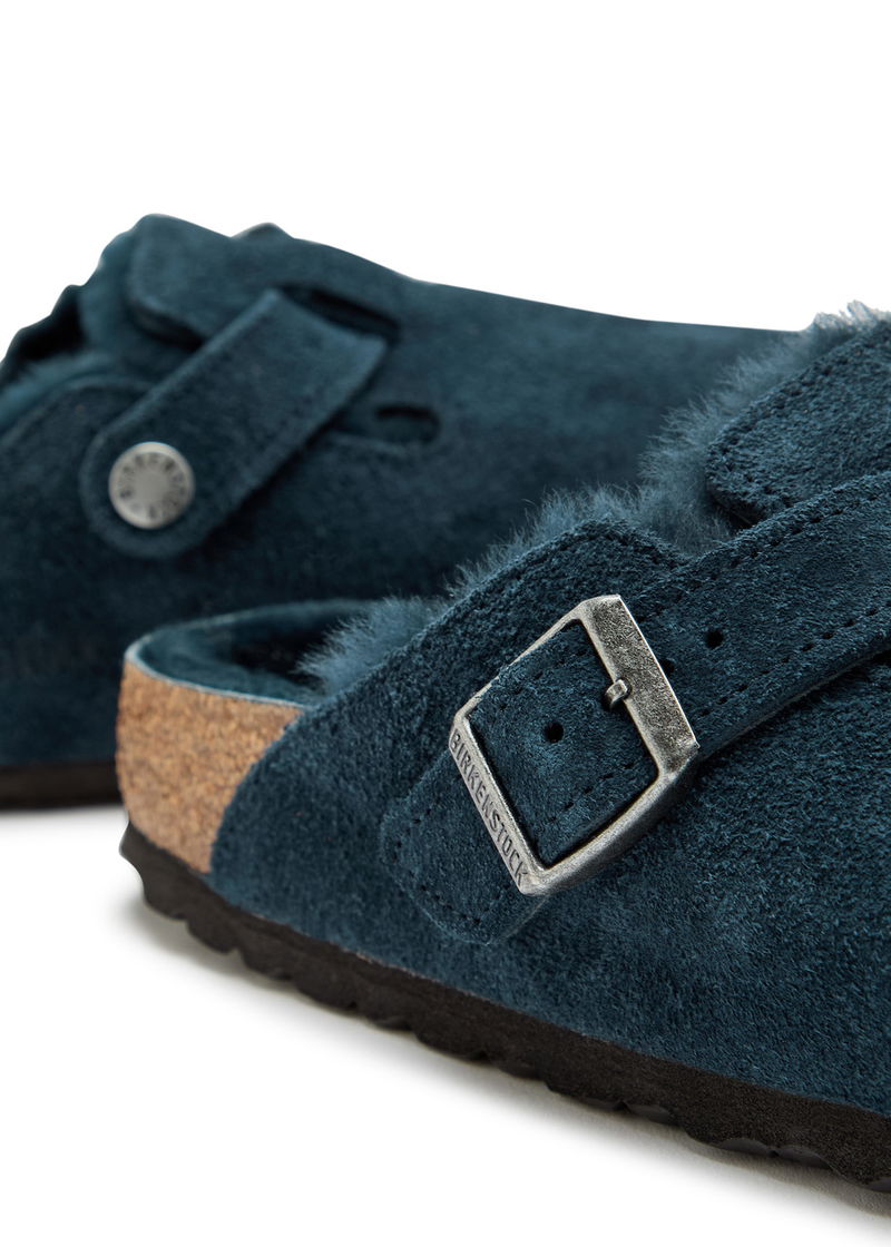 Birkenstock suede clogs. Adjustable buckle-fastening strap, notched details, designer-engraved hardware, shearling lining, contoured footbed, cork midsole, EVA sole, round toe.