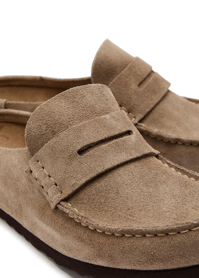 • Penny strap, contoured footbed, gripped rubber sole, round toe