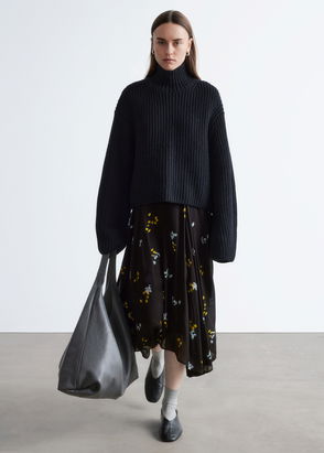 Skirt, Wool-crepe, Pleated, Asymmetric hem, Concealed hook and zip fastening at side, Mid-weight, non-stretchy fabric.