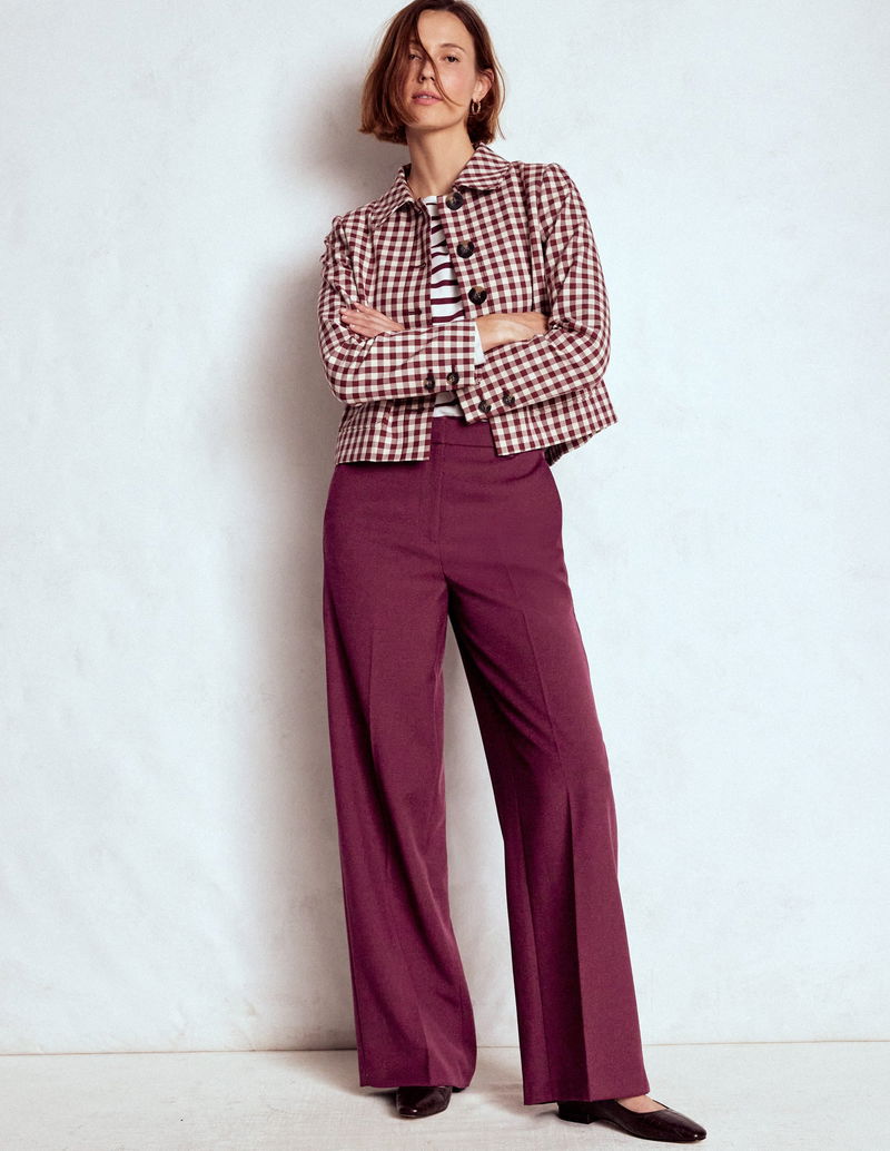The tailored Belgravia trousers are made from a wool-blend fabric that feels fresh and modern. They sit on the natural waist and have a wide leg that skims the floor – dress up for work with heels.