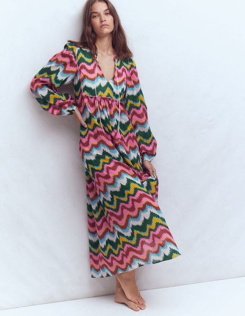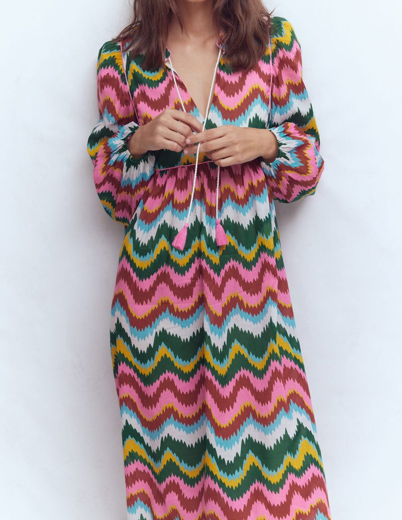 Boho Tie Neck Kaftan-Multi, Zig Zag Wave
