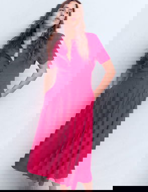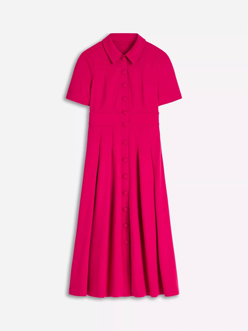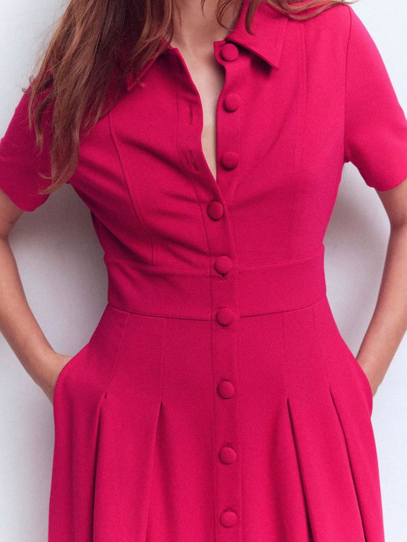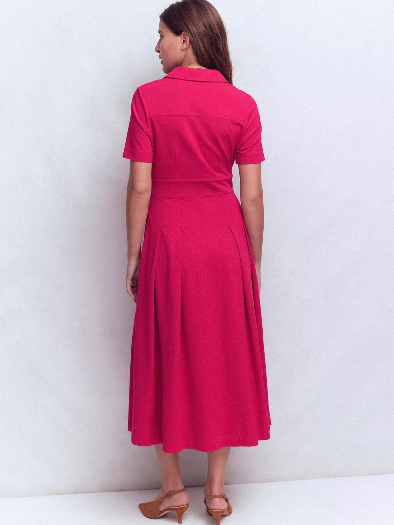 A vintage-inspired shirt dress created for the demands of modern life. Featuring fabric-covered buttons, season-defying short sleeves and intricate pleats and pintucks, it fits like a dream and will not crease.