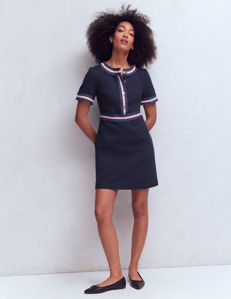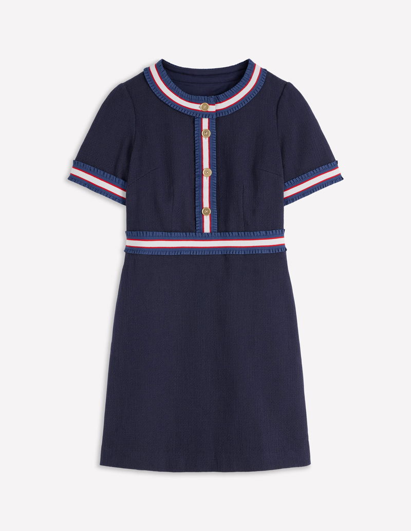 Button Short Dress-Navy Ribbon Trim