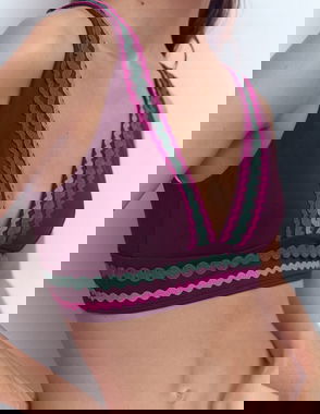 With adjustable shoulder straps, this shape-enhancing, twist-front bikini top features gentle ruching at the neckline and padded, fixed cups for support. Take your pick from textured or printed styles.