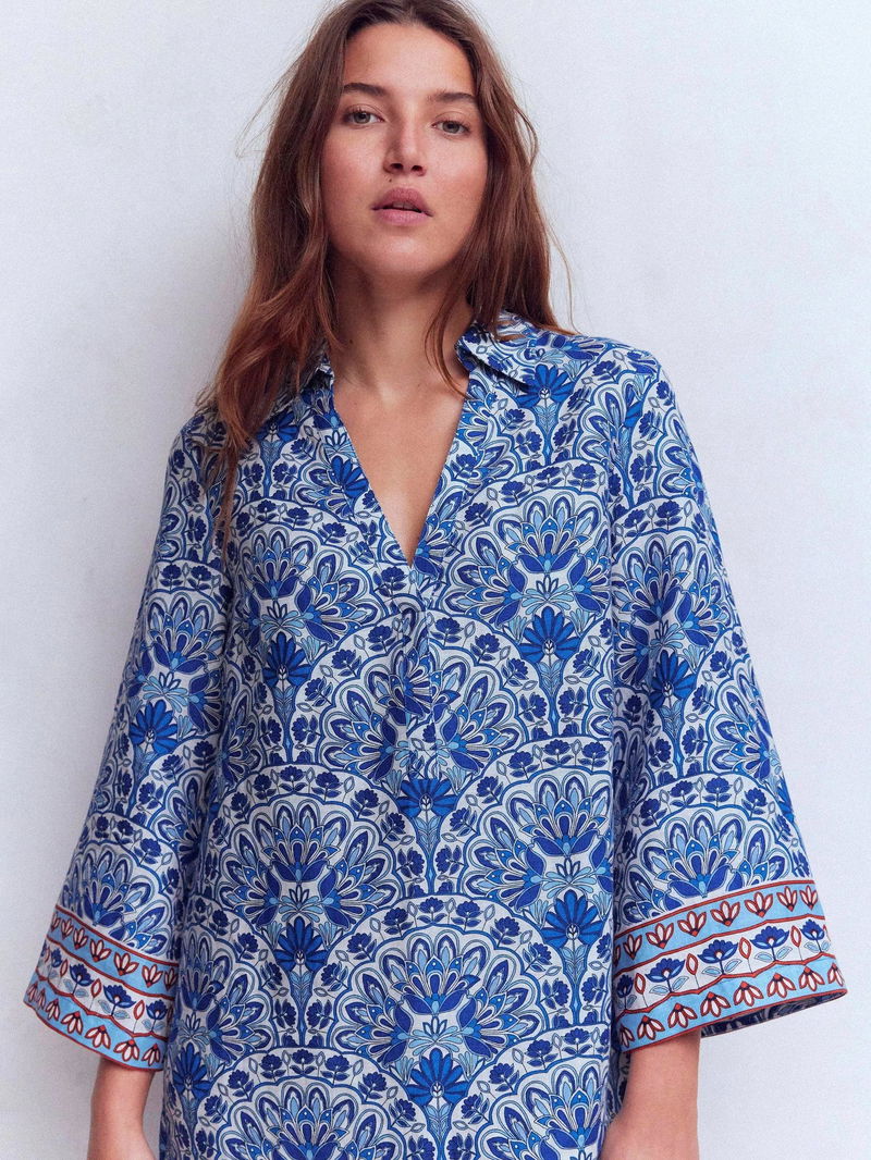 Carmen Floral Pure Linen Dress, Blue