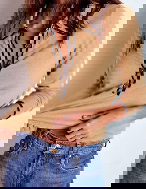 This light collared jumper is 100% cotton with drop shoulders for a relaxed easy feel. The scallop edges and V-neck add some style power to this summer must-have.