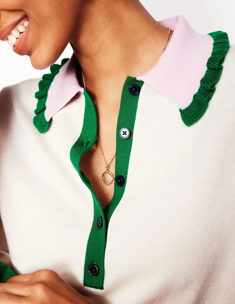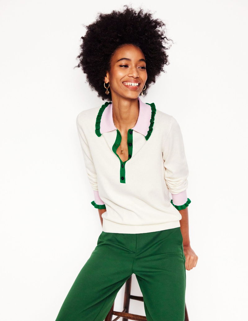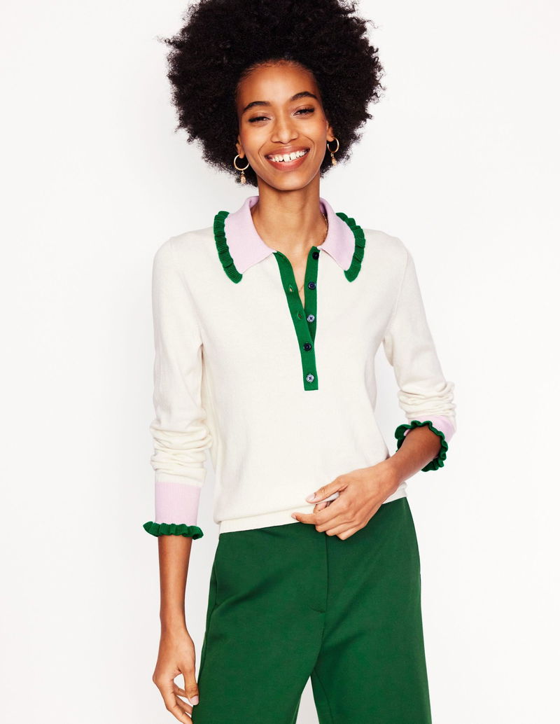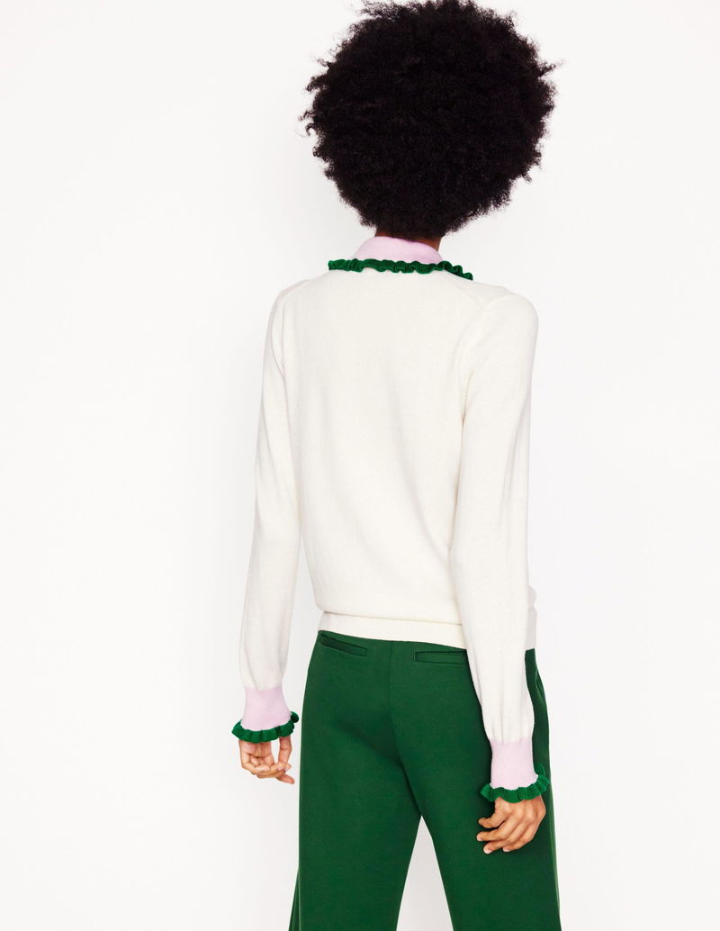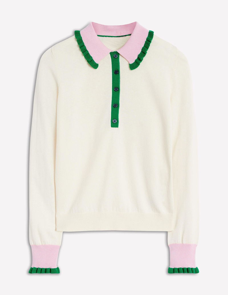 This preppy cotton jumper is ready to serve an education in knitwear. Between the colour contrast tipping and the ruffled knit trim, consider fashion school in session.