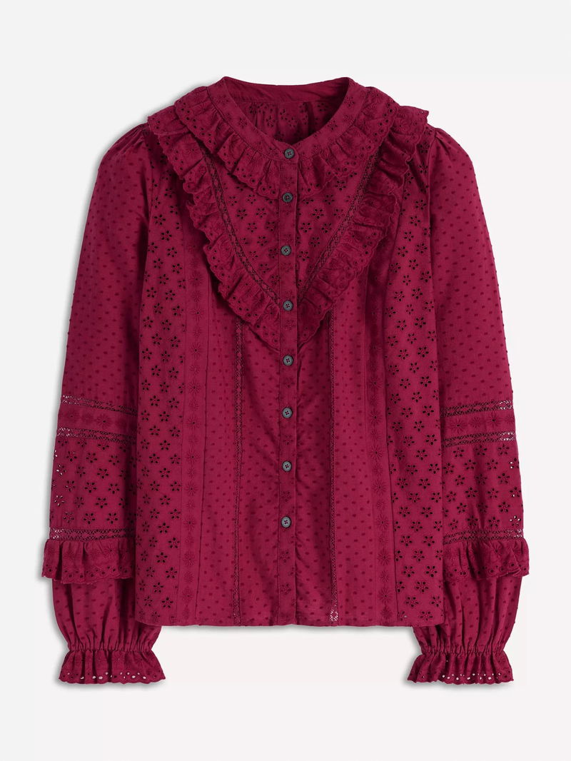Cotton Broderie Ruffle Long Sleeve Collar Blouse