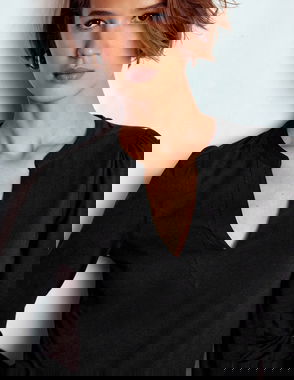 With its colour-popping chevron print and look-at-me sleeves, this is a standout shirt. It's crafted from a drapey fabric and has a flattering, semi-fitted shape. An understated crew neck lets the pattern take centre stage, while concealed buttons discreetly close the front. Look to the keyhole openings at the cuffs for a final refined detail.