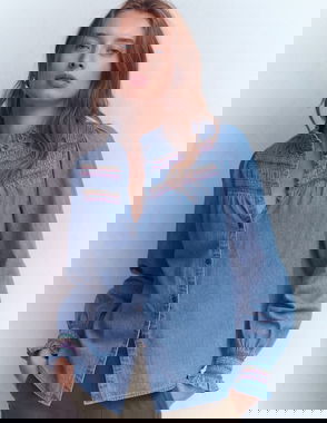 This denim shirt makes a style statement by combining structure with soft curves. Its long sleeves are generously full, with gentle gathers at the cuffs and puffed shoulders. Buttons down the front make it easy to adjust your neckline, while top-stitched detailing and a stand-up collar with a stripe trim at the back of the neck add subtle detail.