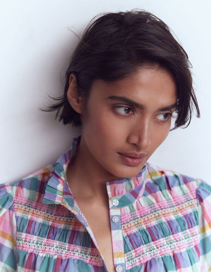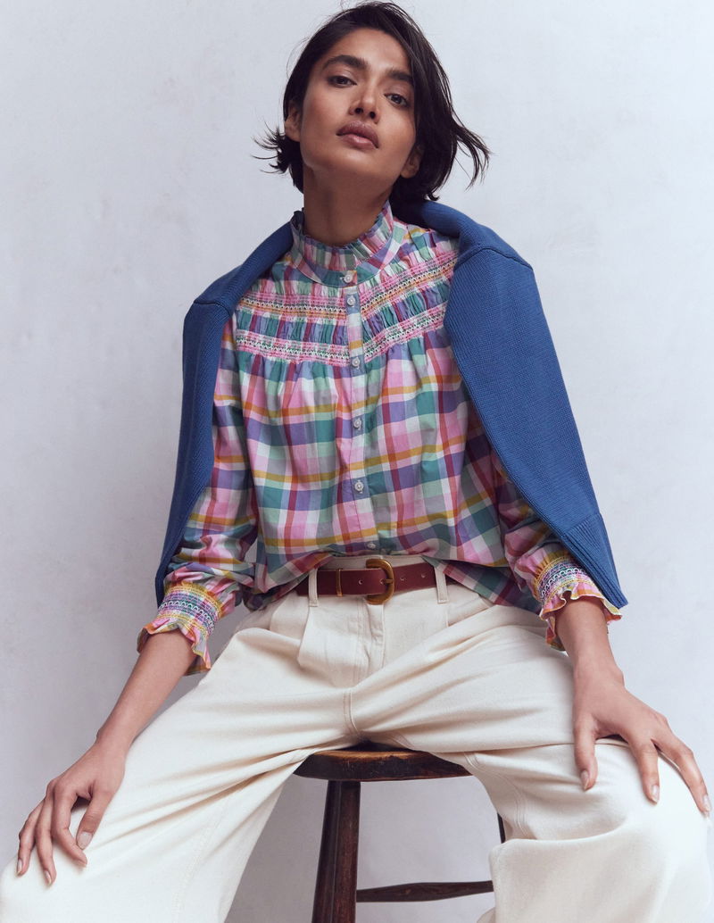 Esme Smocked Detail Frill Top-Multi Check