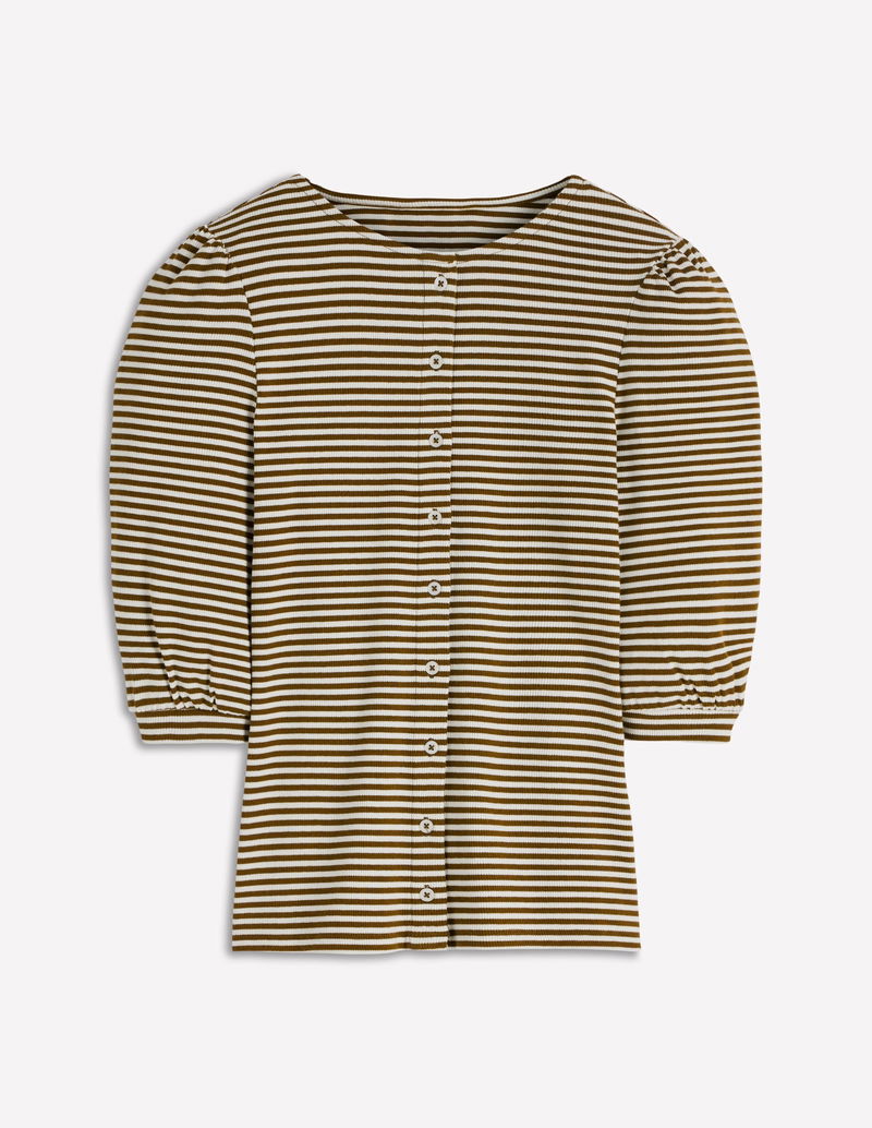 Evie Ribbed Puff Sleeve Top-Potting Soil, Ivory Stripe