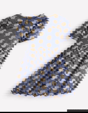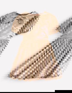 Let Minis shine in this showstopping metallic dress. With its puff sleeves, ruffles and sash bow, it will dazzle – quite literally. Better make sure your camera roll has plenty of space.