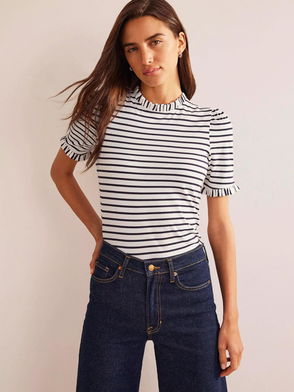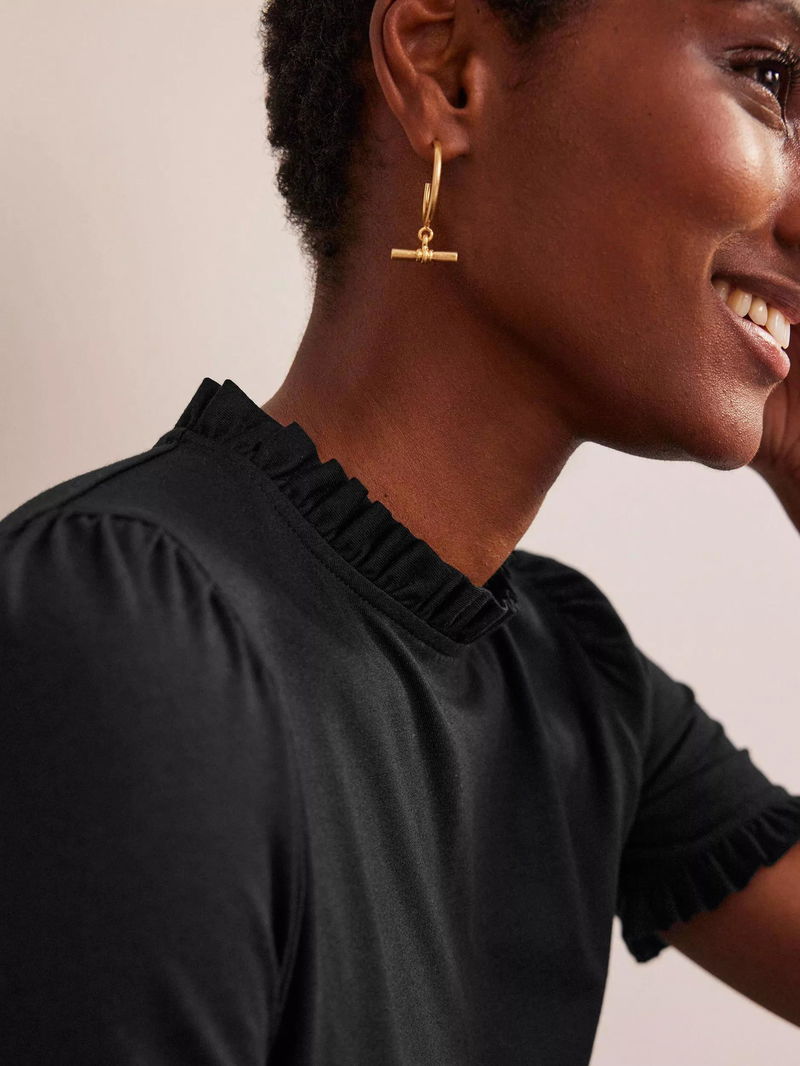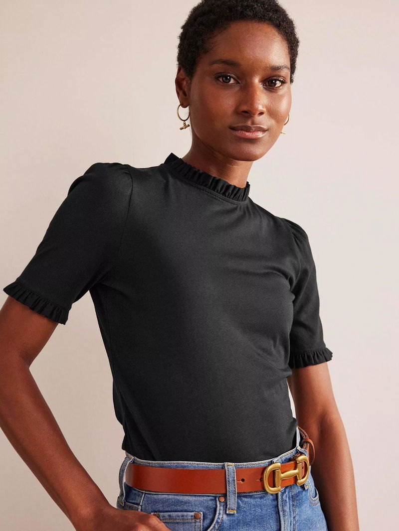 A simple cotton tee with a point of difference - this one has frilled trims and short puffed sleeves. Perfect for when you want to throw on something easy but still look put-together.