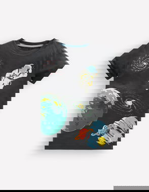 These colourful prints are already pretty exciting. But when Minis find out they glow in the dark? Expect lots of joyful jumping up and down. Don't forget to charge this T-shirt in direct sunlight first, so it can light up every room – just like your Mini's grin.