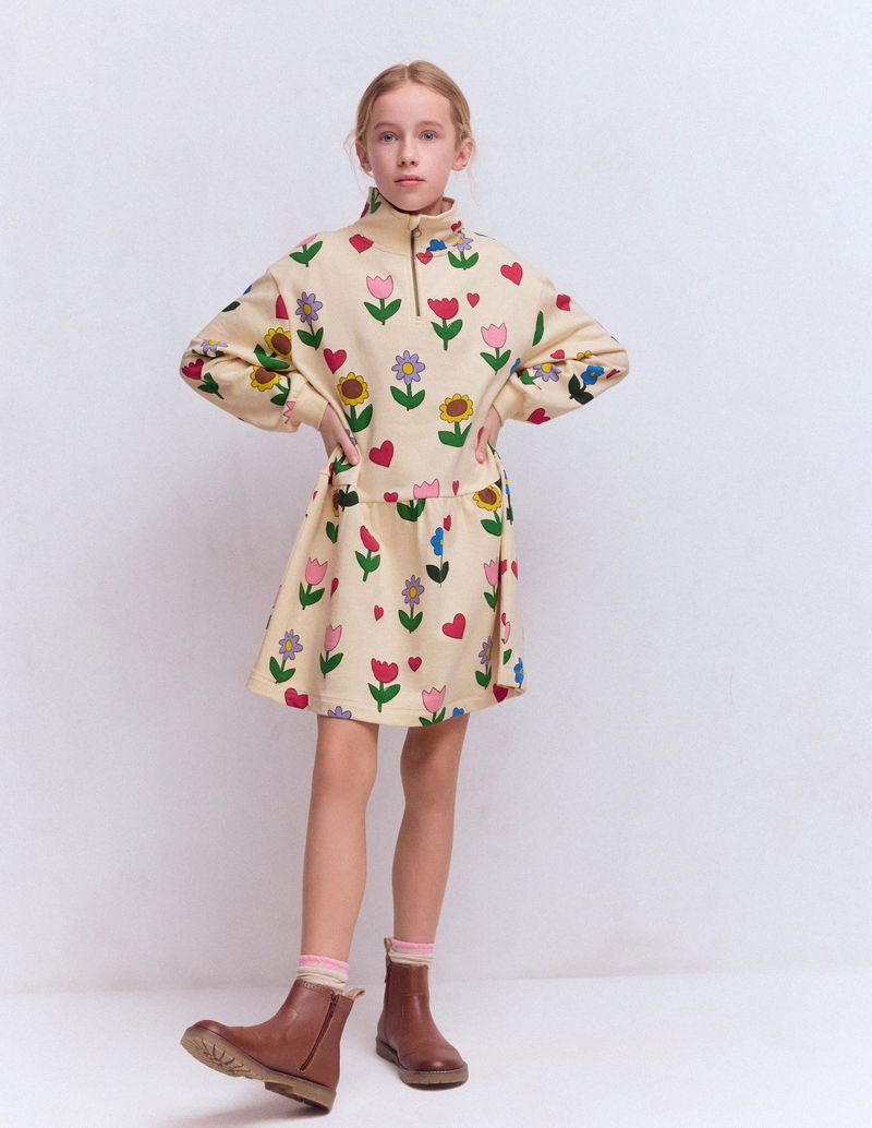Half Zip Sweat Dress-Calico White Sunflower Garden