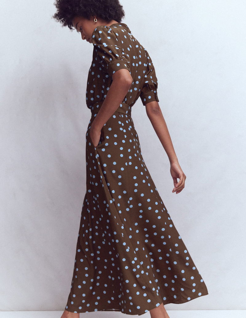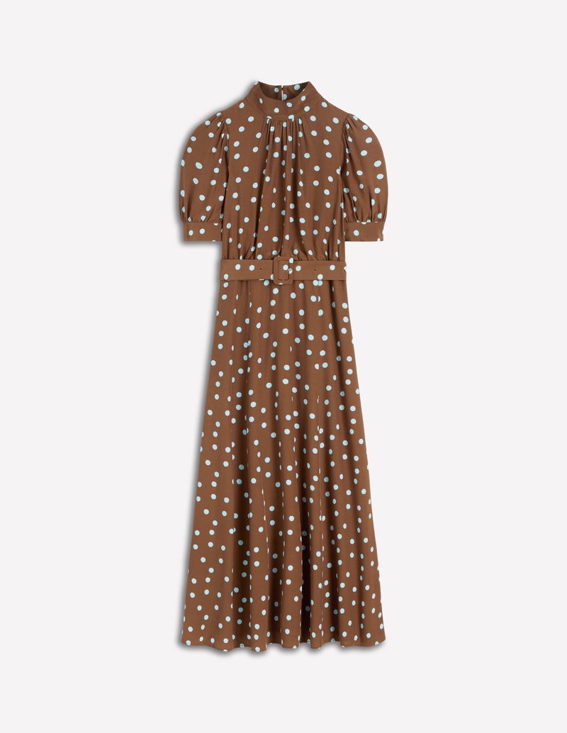 High Neck Belted Dress-Raw Umber, Painted Dot