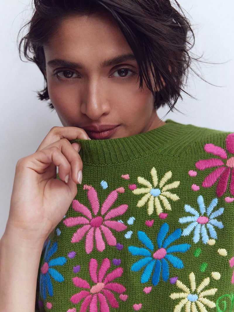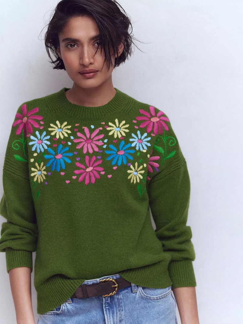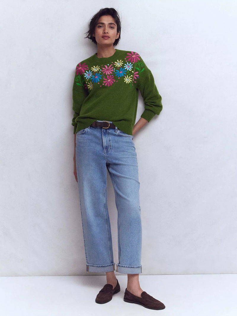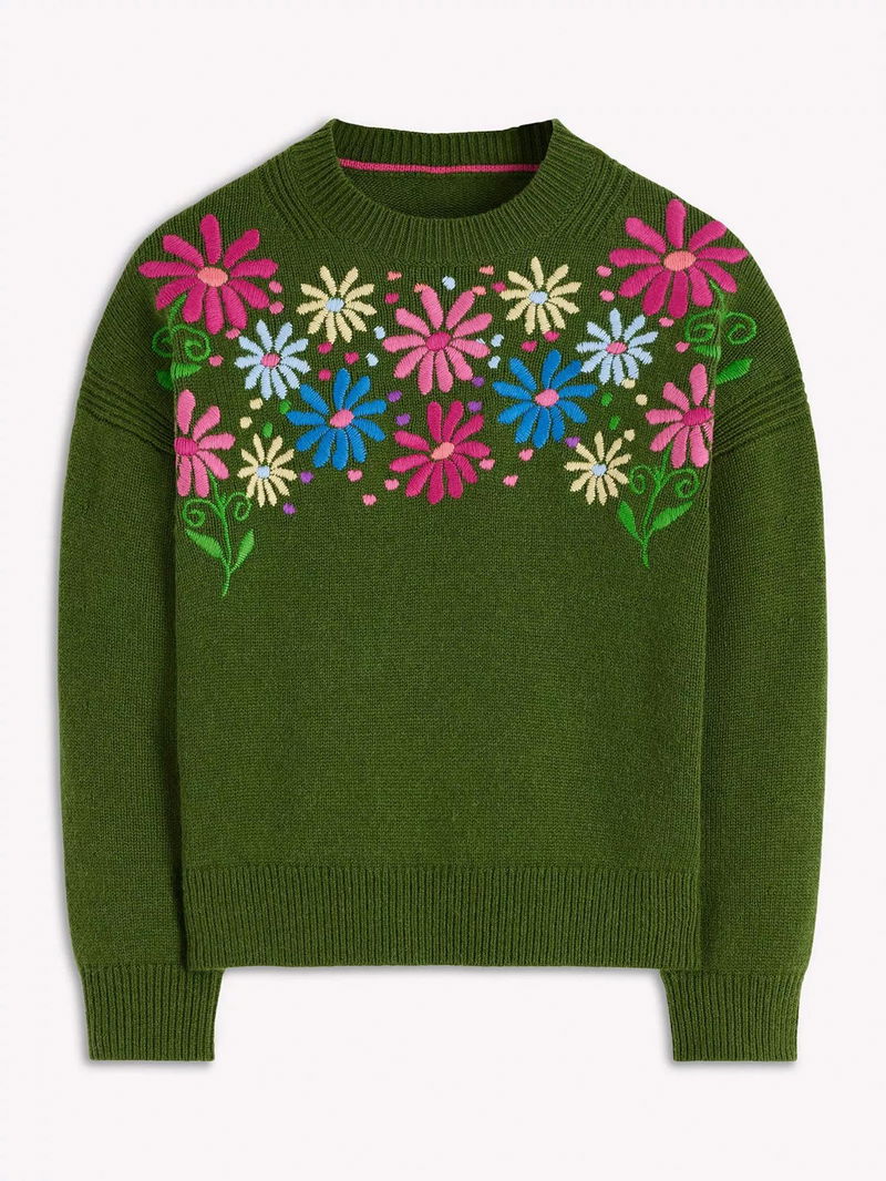 Isa Embroidered Floral Wool Blend Jumper, Garden Green