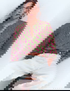 Semi-fitted and featuring a deep V-neck, this airy top has a modern-classic feel. The cuffs and shoulders feature traditional stretchy gathers, which the brand has updated with multi-coloured stitching. Supersoft cotton-blend fabric keeps it light and breathable for all-day comfort. To be assured of everyday elegance, you just have to choose from eye-catching ivory or understated navy.