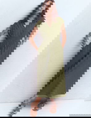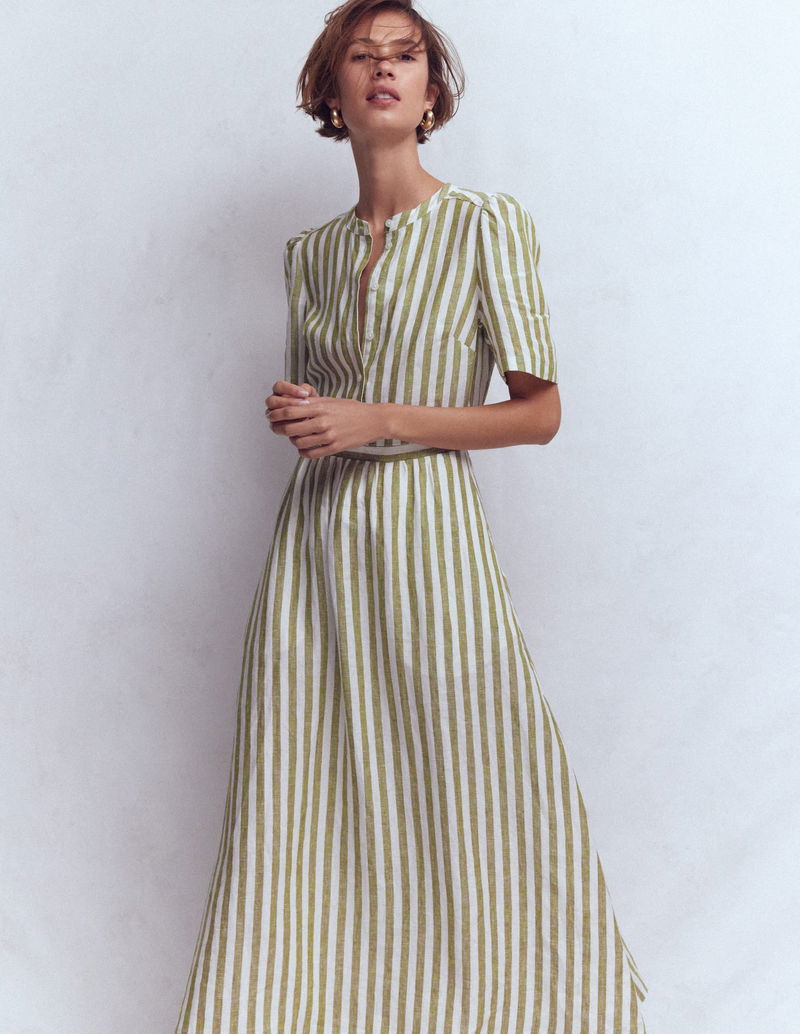 Ivy Linen Midi Dress-Olive, Ivory Stripe